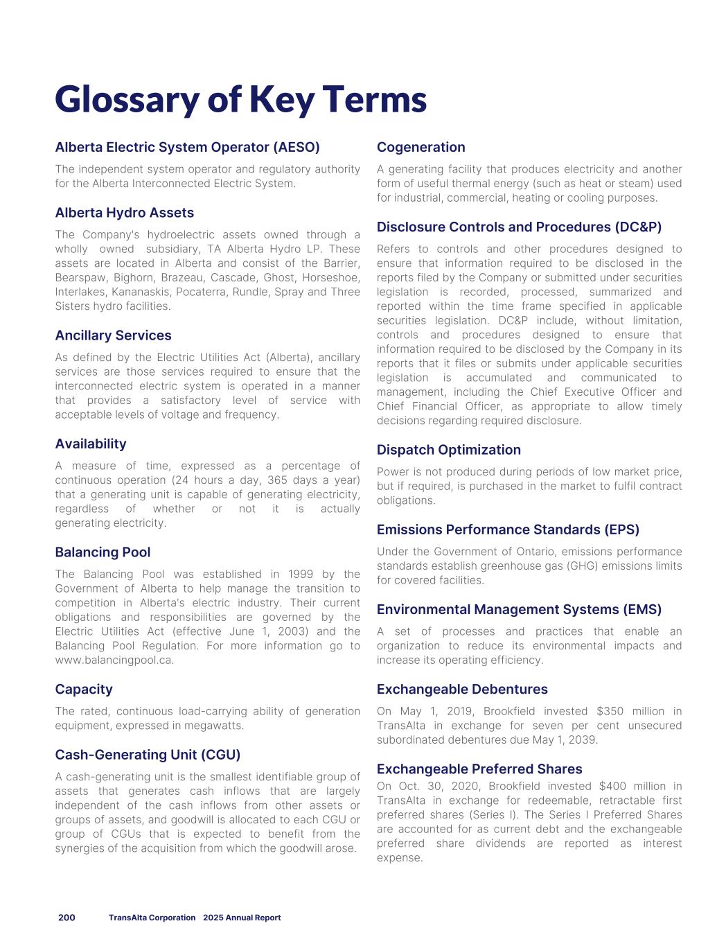 Glossary of Key Terms Alberta Electric System Operator (AESO) The independent system operator and regulatory authority for the Alberta Interconnected Electric System. Alberta Hydro Assets The Company's hydroelectric assets owned through a wholly owned subsidiary, TA Alberta Hydro LP. These assets are located in Alberta and consist of the Barrier, Bearspaw, Bighorn, Brazeau, Cascade, Ghost, Horseshoe, Interlakes, Kananaskis, Pocaterra, Rundle, Spray and Three Sisters hydro facilities. Ancillary Services As defined by the Electric Utilities Act (Alberta), ancillary services are those services required to ensure that the interconnected electric system is operated in a manner that provides a satisfactory level of service with acceptable levels of voltage and frequency. Availability A measure of time, expressed as a percentage of continuous operation (24 hours a day, 365 days a year) that a generating unit is capable of generating electricity, regardless of whether or not it is actually generating electricity. Balancing Pool The Balancing Pool was established in 1999 by the Government of Alberta to help manage the transition to competition in Alberta's electric industry. Their current obligations and responsibilities are governed by the Electric Utilities Act (effective June 1, 2003) and the Balancing Pool Regulation. For more information go to www.balancingpool.ca. Capacity The rated, continuous load-carrying ability of generation equipment, expressed in megawatts. Cash-Generating Unit (CGU) A cash-generating unit is the smallest identifiable group of assets that generates cash inflows that are largely independent of the cash inflows from other assets or groups of assets, and goodwill is allocated to each CGU or group of CGUs that is expected to benefit from the synergies of the acquisition from which the goodwill arose. Cogeneration A generating facility that produces electricity and another form of useful thermal energy (such as heat or steam) used for industrial, commercial, heating or cooling purposes. Disclosure Controls and Procedures (DC&P) Refers to controls and other procedures designed to ensure that information required to be disclosed in the reports filed by the Company or submitted under securities legislation is recorded, processed, summarized and reported within the time frame specified in applicable securities legislation. DC&P include, without limitation, controls and procedures designed to ensure that information required to be disclosed by the Company in its reports that it files or submits under applicable securities legislation is accumulated and communicated to management, including the Chief Executive Officer and Chief Financial Officer, as appropriate to allow timely decisions regarding required disclosure. Dispatch Optimization Power is not produced during periods of low market price, but if required, is purchased in the market to fulfil contract obligations. Emissions Performance Standards (EPS) Under the Government of Ontario, emissions performance standards establish greenhouse gas (GHG) emissions limits for covered facilities. Environmental Management Systems (EMS) A set of processes and practices that enable an organization to reduce its environmental impacts and increase its operating efficiency. Exchangeable Debentures On May 1, 2019, Brookfield invested $350 million in TransAlta in exchange for seven per cent unsecured subordinated debentures due May 1, 2039. Exchangeable Preferred Shares On Oct. 30, 2020, Brookfield invested $400  million in TransAlta in exchange for redeemable, retractable first preferred shares (Series I). The Series I Preferred Shares are accounted for as current debt and the exchangeable preferred share dividends are reported as interest expense. 200 TransAlta Corporation 2025 Annual Report