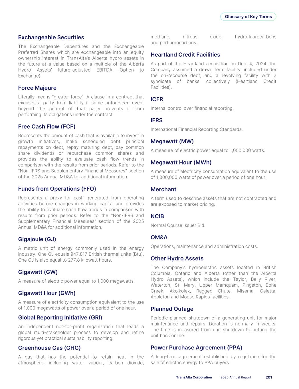 Exchangeable Securities The Exchangeable Debentures and the Exchangeable Preferred Shares which are exchangeable into an equity ownership interest in TransAlta’s Alberta hydro assets in the future at a value based on a multiple of the Alberta Hydro Assets’ future-adjusted EBITDA (Option to Exchange). Force Majeure Literally means “greater force”. A clause in a contract that excuses a party from liability if some unforeseen event beyond the control of that party prevents it from performing its obligations under the contract. Free Cash Flow (FCF) Represents the amount of cash that is available to invest in growth initiatives, make scheduled debt principal repayments on debt, repay maturing debt, pay common share dividends or repurchase common shares and provides the ability to evaluate cash flow trends in comparison with the results from prior periods. Refer to the "Non-IFRS and Supplementary Financial Measures" section of the 2025 Annual MD&A for additional information. Funds from Operations (FFO) Represents a proxy for cash generated from operating activities before changes in working capital and provides the ability to evaluate cash flow trends in comparison with results from prior periods. Refer to the "Non-IFRS and Supplementary Financial Measures" section of the 2025 Annual MD&A for additional information. Gigajoule (GJ) A metric unit of energy commonly used in the energy industry. One GJ equals 947,817 British thermal units (Btu). One GJ is also equal to 277.8 kilowatt hours. Gigawatt (GW) A measure of electric power equal to 1,000 megawatts. Gigawatt Hour (GWh) A measure of electricity consumption equivalent to the use of 1,000 megawatts of power over a period of one hour. Global Reporting Initiative (GRI) An independent not-for-profit organization that leads a global multi-stakeholder process to develop and refine rigorous yet practical sustainability reporting. Greenhouse Gas (GHG) A gas that has the potential to retain heat in the atmosphere, including water vapour, carbon dioxide, methane, nitrous oxide, hydrofluorocarbons and perfluorocarbons. Heartland Credit Facilities As part of the Heartland acquisition on Dec. 4, 2024, the Company assumed a drawn term facility, included under the on-recourse debt, and a revolving facility with a syndicate of banks, collectively (Heartland Credit Facilities). ICFR Internal control over financial reporting. IFRS International Financial Reporting Standards. Megawatt (MW) A measure of electric power equal to 1,000,000 watts. Megawatt Hour (MWh) A measure of electricity consumption equivalent to the use of 1,000,000 watts of power over a period of one hour. Merchant A term used to describe assets that are not contracted and are exposed to market pricing. NCIB Normal Course Issuer Bid. OM&A Operations, maintenance and administration costs. Other Hydro Assets The Company's hydroelectric assets located in British Columbia, Ontario and Alberta (other than the Alberta Hydro Assets), which include the Taylor, Belly River, Waterton, St. Mary, Upper Mamquam, Pingston, Bone Creek, Akolkolex, Ragged Chute, Misema, Galetta, Appleton and Moose Rapids facilities. Planned Outage Periodic planned shutdown of a generating unit for major maintenance and repairs. Duration is normally in weeks. The time is measured from unit shutdown to putting the unit back online. Power Purchase Agreement (PPA) A long-term agreement established by regulation for the sale of electric energy to PPA buyers. TransAlta Corporation 2025 Annual Report 201