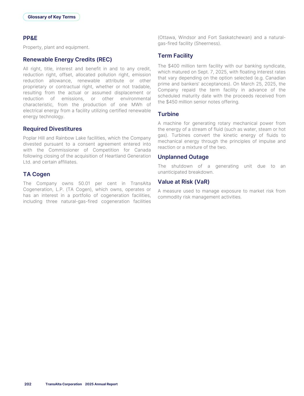 PP&E Property, plant and equipment. Renewable Energy Credits (REC) All right, title, interest and benefit in and to any credit, reduction right, offset, allocated pollution right, emission reduction allowance, renewable attribute or other proprietary or contractual right, whether or not tradable, resulting from the actual or assumed displacement or reduction of emissions, or other environmental characteristic, from the production of one MWh of electrical energy from a facility utilizing certified renewable energy technology. Required Divestitures Poplar Hill and Rainbow Lake facilities, which the Company divested pursuant to a consent agreement entered into with the Commissioner of Competition for Canada following closing of the acquisition of Heartland Generation Ltd. and certain affiliates. TA Cogen The Company owns 50.01 per cent in TransAlta Cogeneration, L.P. (TA Cogen), which owns, operates or has an interest in a portfolio of cogeneration facilities, including three natural-gas-fired cogeneration facilities (Ottawa, Windsor and Fort Saskatchewan) and a natural- gas-fired facility (Sheerness). Term Facility The $400 million term facility with our banking syndicate, which matured on Sept. 7, 2025, with floating interest rates that vary depending on the option selected (e.g. Canadian prime and bankers' acceptances). On March 25, 2025, the Company repaid the term facility in advance of the scheduled maturity date with the proceeds received from the $450 million senior notes offering. Turbine A machine for generating rotary mechanical power from the energy of a stream of fluid (such as water, steam or hot gas). Turbines convert the kinetic energy of fluids to mechanical energy through the principles of impulse and reaction or a mixture of the two. Unplanned Outage The shutdown of a generating unit due to an unanticipated breakdown. Value at Risk (VaR) A measure used to manage exposure to market risk from commodity risk management activities. 202 TransAlta Corporation 2025 Annual Report