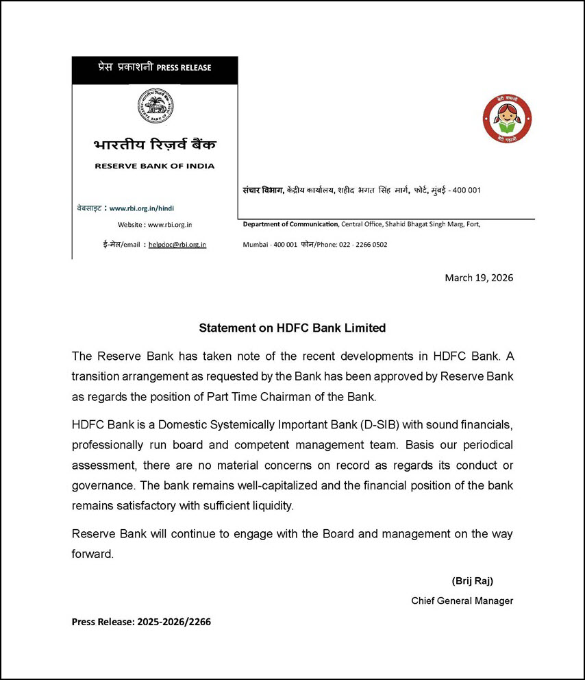 PRESS RELEASE RESERVE BANK OF INDIA www.rbi.org.in/hindi Website: www.rbi.org.in email: helpdoc@rbi.org.in Department of Communication, Central Office, Shahid Bhagat Singh Marg, Fort, Mumbai - 400.001 / Phone: 022 - 2266 0502 March 19, 2026 Statement on HDFC Bank Limited The Reserve Bank has taken note of the recent developments in HDFC Bank A transition arrangement as requested by the Bank has been approved by Reserve Bank as regards the position of Part Time Chairman of the Bank. HDFC Bank is a Domestic Systemically Important Bank (O-SIB) with sound financials, professionally run board and competent management team. Basis our periodical assessment, there are no material concerns on record as regards its conduct or governance. The bank remains well-capitalized and the financial position of the bank remains satisfactory with sufficient liquidity. Reserve Bank will continue to engage with the Board and management on the way forward. (Brij Raj) Chief General Manager Press Release: 2025-2026/2266
