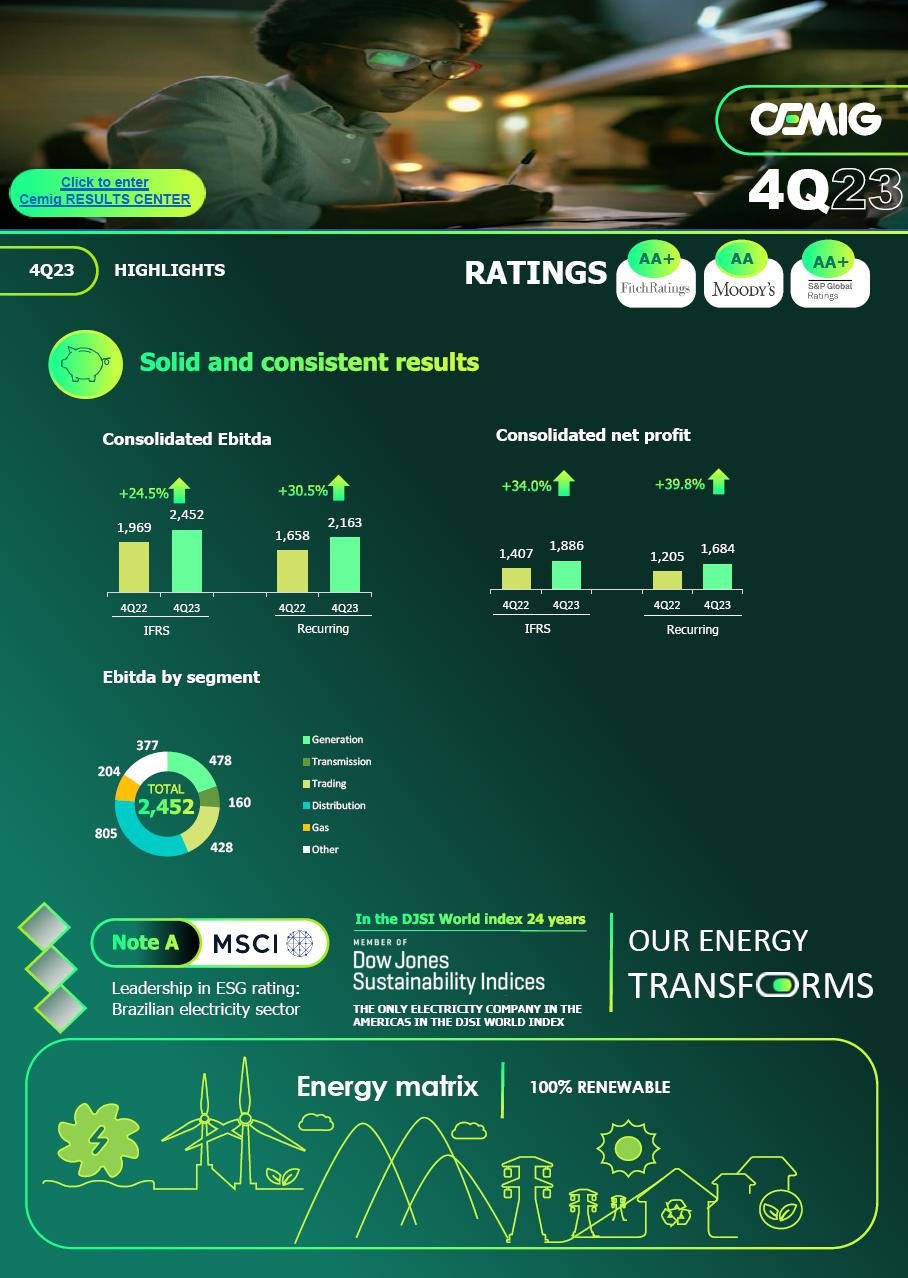 COMPANHIA ENERGÉTICA DE MINAS GERAIS – CEMIG (“CEMIG” or “Company”), a publicly-held company with shares traded on the stock exchanges of São Paulo, New York, and Madrid, pursuant to its commitment to adopting the best corporate governance practices, hereby informs its shareholders and the market in general that it has been included in S&P Global’s “Sustainability Yearbook 2024,” putting the Company in the list of the most sustainable companies in the world.