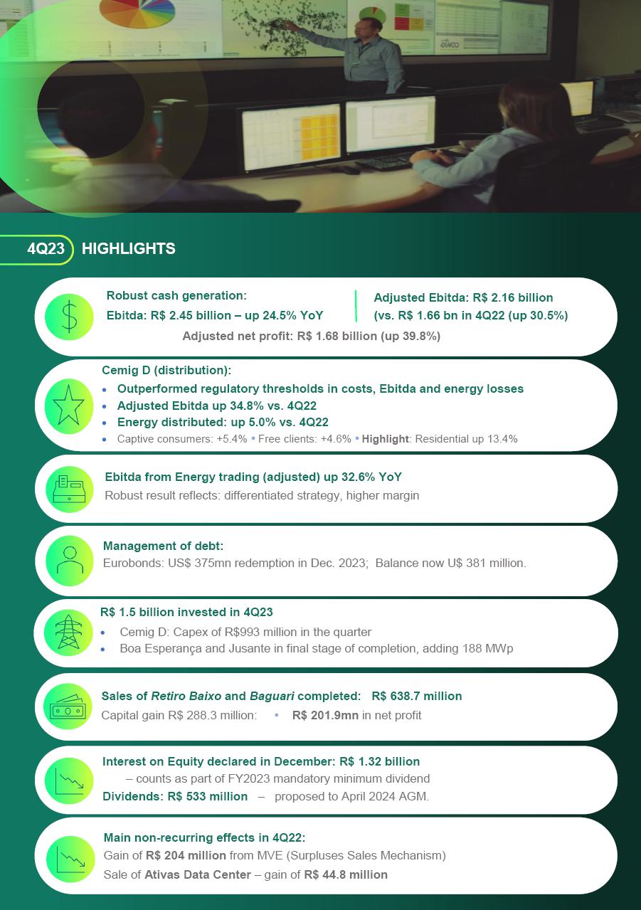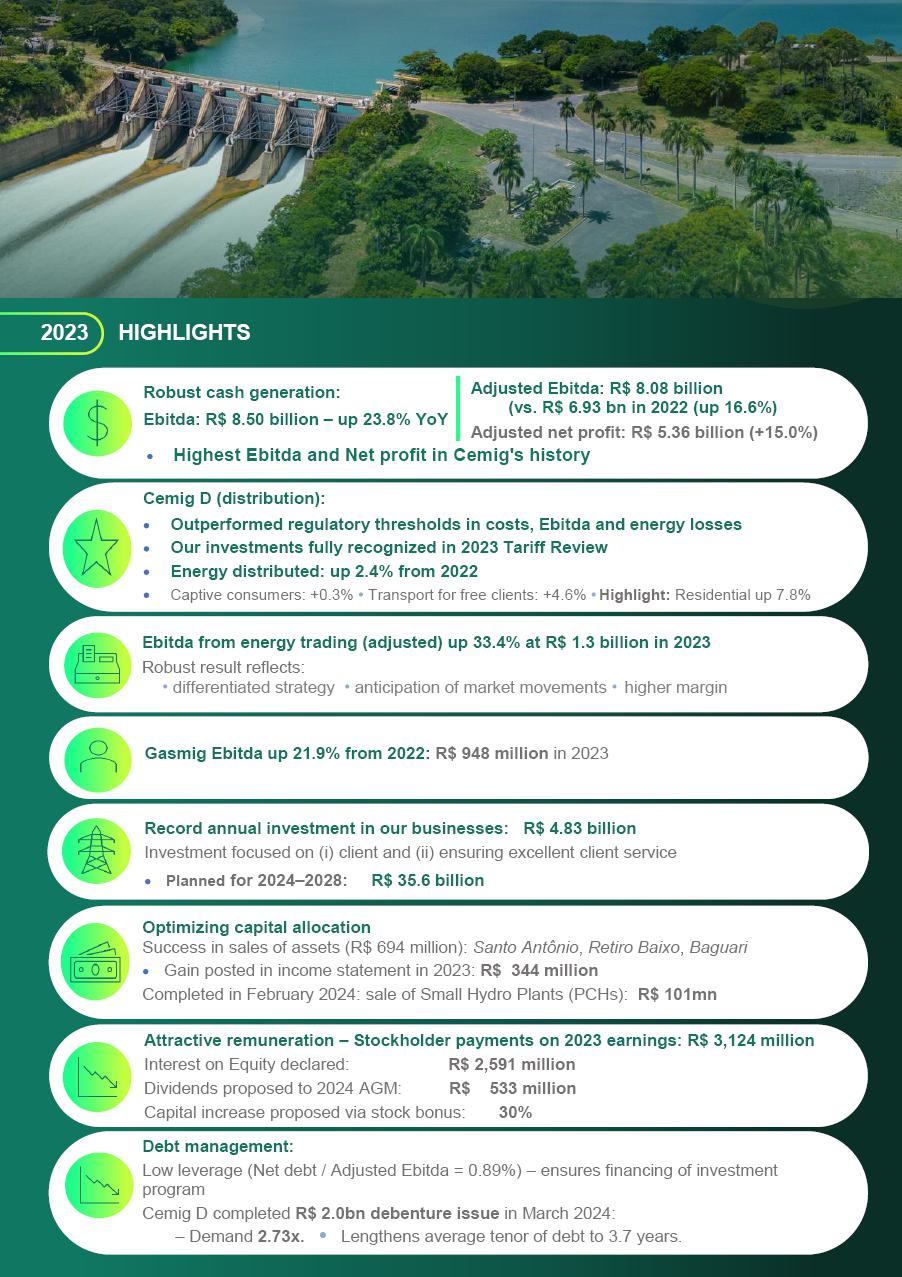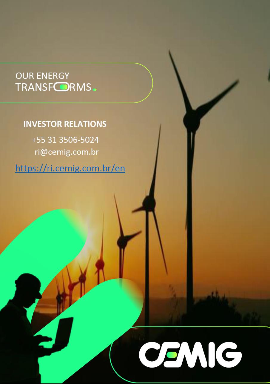 COMPANHIA ENERGÉTICA DE MINAS GERAIS – CEMIG (“Cemig”), a category “A” publicly-held company with shares traded on the stock exchanges of São Paulo, New York, and Madrid, hereby informs the Brazilian Securities and Exchange Commission (CVM), B3 S.A. – Brasil, Bolsa, Balcão, and the market in general that, on March 15, 2024, CEMIG DISTRIBUIÇÃO S.A. (“Cemig D”), a category “B” publicly-held company and the wholly-owned subsidiary of Cemig, concluded the financial liquidation of the 10th (tenth) issue of simple, unsecured debentures, not convertible into shares, with an additional personal guarantee, in two series (“Issue”), for public distribution, under the automatic registration procedure with CVM, under the terms of Resolution 160 of the Brazilian Securities and Exchange Commission of 07/13/2022, as amended (“CVM Resolution 160”), which are guaranteed by Cemig (“Debentures”).