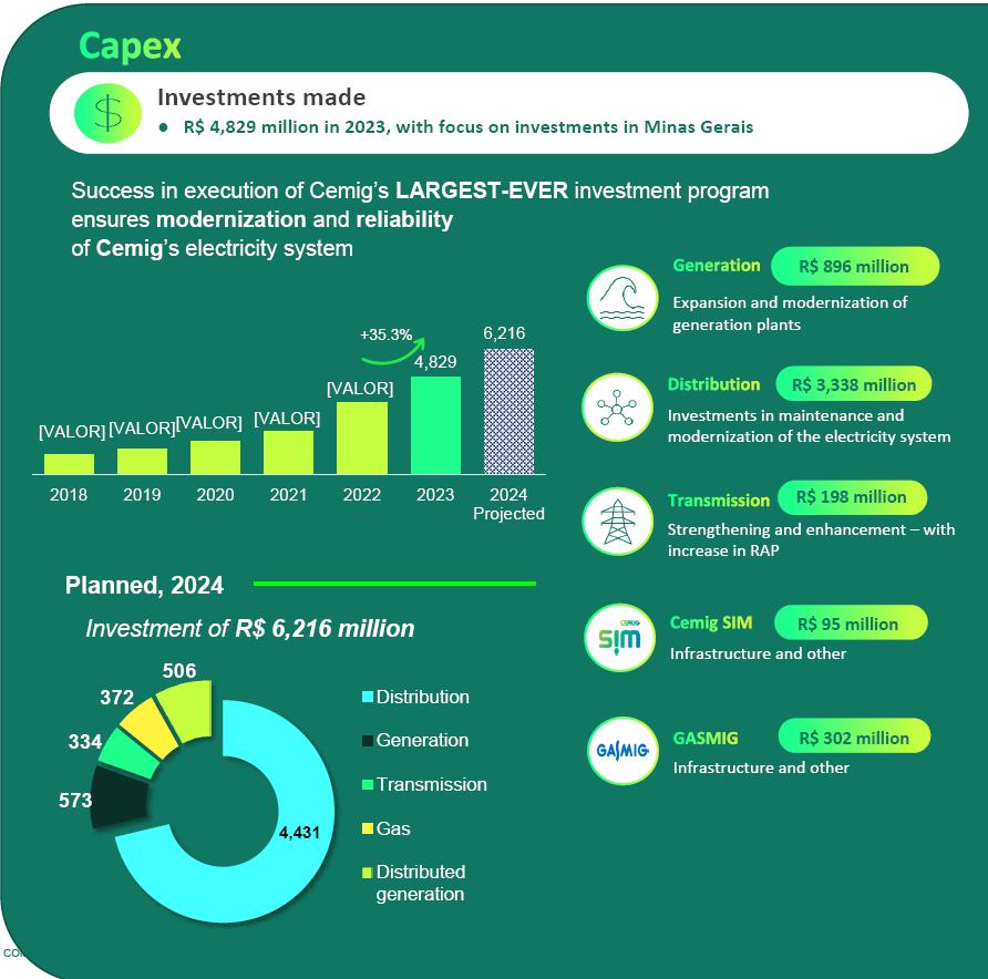 COMPANHIA ENERGÉTICA DE MINAS GERAIS – CEMIG (“CEMIG” or “Company”), a publicly-held company with shares traded on the stock exchanges of São Paulo, New York, and Madrid, pursuant to CVM Resolution 44/2021, of August 23, 2021, hereby announces to the Brazilian Securities and Exchange Commission (CVM), B3 S.A. – Brasil, Bolsa, Balcão (“B3”) and the market in general its investment projections for the 2024-2028 period, in the amount of R$35.6 billion, as detailed below.