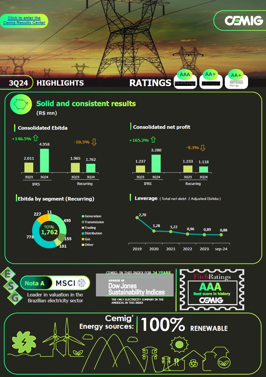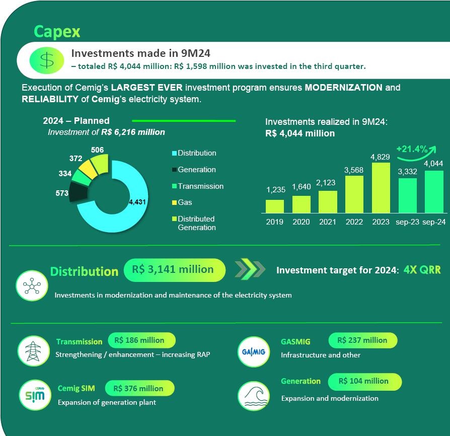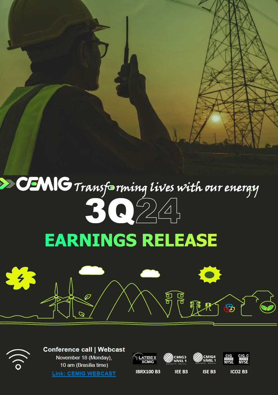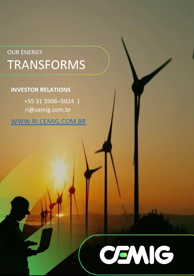 CEMIG reiterates its commitment to focusing on the state of Minas Gerais, mainly engaging in the generation, transmission, and distribution of energy, providing excellent services for customers, with safety and maximum efficiency, through sustainable and results-oriented management, making the greatest investment in the Company’s history.