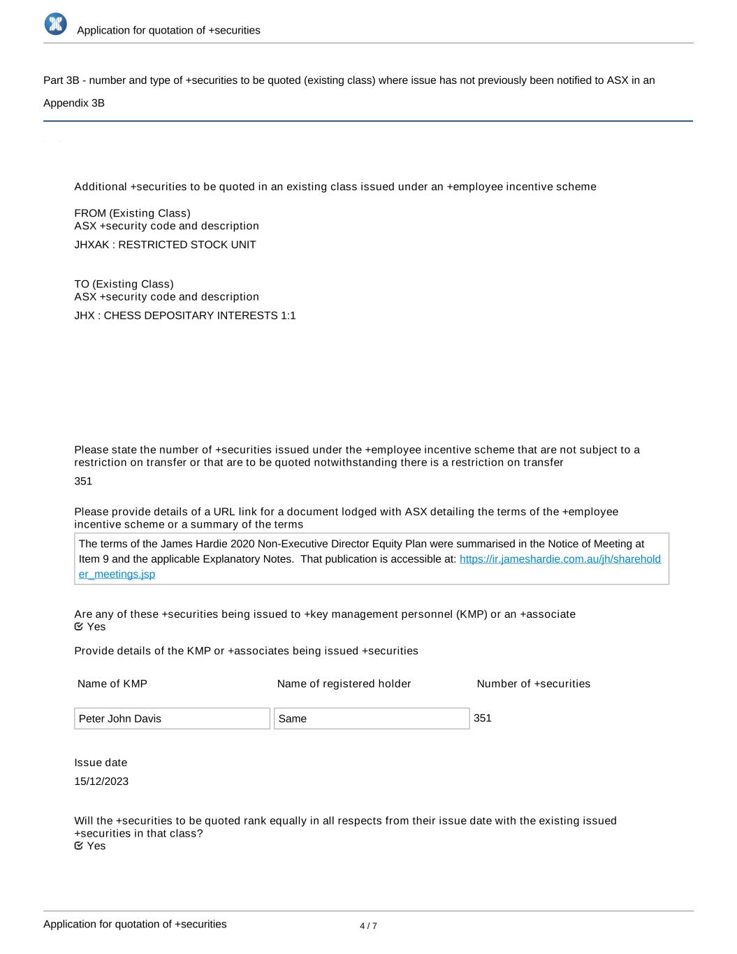 Application for quotation of +securities Application for quotation of +securities 4 / 7 Part 3B - number and type of +securities to be quoted (existing class) where issue has not previously been notified to ASX in an Appendix 3B Additional +securities to be quoted in an existing class issued under an +employee incentive scheme FROM (Existing Class) ASX +security code and description JHXAK : RESTRICTED STOCK UNIT TO (Existing Class) ASX +security code and description JHX : CHESS DEPOSITARY INTERESTS 1:1 Please state the number of +securities issued under the +employee incentive scheme that are not subject to a restriction on transfer or that are to be quoted notwithstanding there is a restriction on transfer 351 Please provide details of a URL link for a document lodged with ASX detailing the terms of the +employee incentive scheme or a summary of the terms The terms of the James Hardie 2020 Non-Executive Director Equity Plan were summarised in the Notice of Meeting at Item 9 and the applicable Explanatory Notes. That publication is accessible at: https://ir.jameshardie.com.au/jh/sharehold er_meetings.jsp Are any of these +securities being issued to +key management personnel (KMP) or an +associate Provide details of the KMP or +associates being issued +securities Name of KMP Name of registered holder Number of +securities Peter John Davis Same 351 Issue date 15/12/2023 Will the +securities to be quoted rank equally in all respects from their issue date with the existing issued +securities in that class? Yes Yes