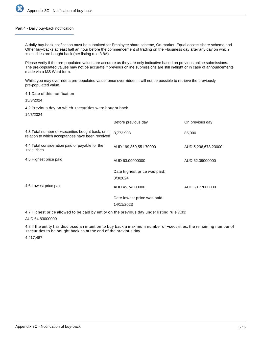 Appendix 3C - Notification of buy-back Appendix 3C - Notification of buy-back 6 / 6 Part 4 - Daily buy-back notification A daily buy-back notification must be submitted for Employee share scheme, On-market, Equal access share scheme and Other buy-backs at least half an hour before the commencement of trading on the +business day after any day on which +securities are bought back (per listing rule 3.8A)   Please verify if the pre-populated values are accurate as they are only indicative based on previous online submissions. The pre-populated values may not be accurate if previous online submissions are still in-flight or in case of announcements made via a MS Word form.   Whilst you may over-ride a pre-populated value, once over-ridden it will not be possible to retrieve the previously pre-populated value. 4.1 Date of this notification 15/3/2024 4.2 Previous day on which +securities were bought back 14/3/2024 Before previous day On previous day 4.3 Total number of +securities bought back, or in relation to which acceptances have been received 3,773,903 85,000 4.4 Total consideration paid or payable for the +securities AUD 199,869,551.70000 AUD 5,236,678.23000 4.5 Highest price paid AUD 63.09000000 AUD 62.39000000 Date highest price was paid: 8/3/2024 4.6 Lowest price paid AUD 45.74000000 AUD 60.77000000 Date lowest price was paid: 14/11/2023 4.7 Highest price allowed to be paid by entity on the previous day under listing rule 7.33: AUD 64.83000000 4.8 If the entity has disclosed an intention to buy back a maximum number of +securities, the remaining number of +securities to be bought back as at the end of the previous day 4,417,487