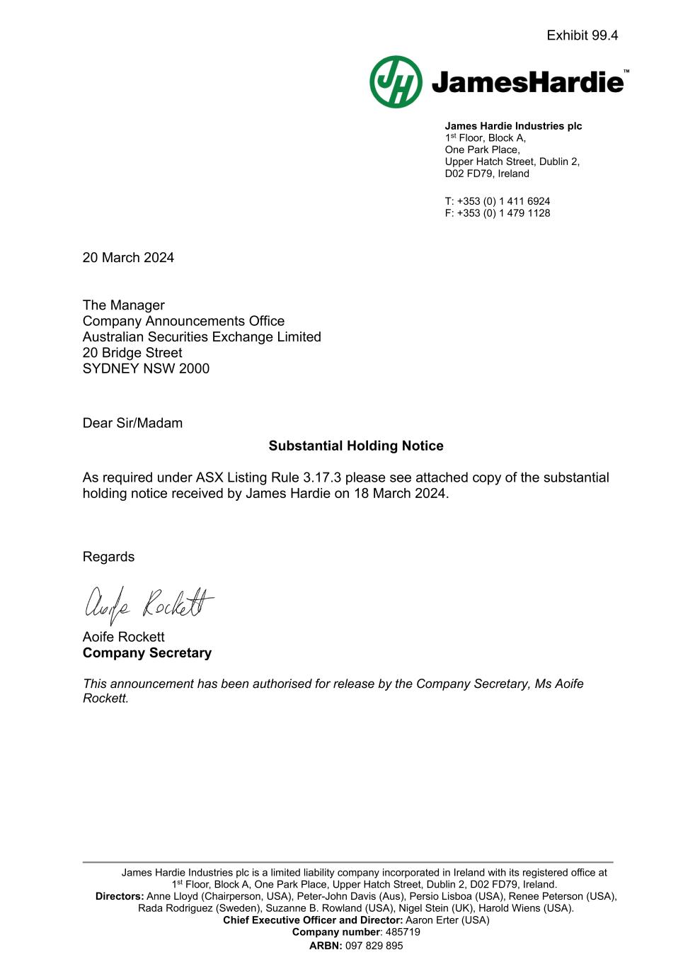 James Hardie Industries plc 1st Floor, Block A, One Park Place, Upper Hatch Street, Dublin 2, D02 FD79, Ireland T: +353 (0) 1 411 6924 F: +353 (0) 1 479 1128 James Hardie Industries plc is a limited liability company incorporated in Ireland with its registered office at 1st Floor, Block A, One Park Place, Upper Hatch Street, Dublin 2, D02 FD79, Ireland. Directors: Anne Lloyd (Chairperson, USA), Peter-John Davis (Aus), Persio Lisboa (USA), Renee Peterson (USA), Rada Rodriguez (Sweden), Suzanne B. Rowland (USA), Nigel Stein (UK), Harold Wiens (USA). Chief Executive Officer and Director: Aaron Erter (USA) Company number: 485719 ARBN: 097 829 895 20 March 2024 The Manager Company Announcements Office Australian Securities Exchange Limited 20 Bridge Street SYDNEY NSW 2000 Dear Sir/Madam Substantial Holding Notice As required under ASX Listing Rule 3.17.3 please see attached copy of the substantial holding notice received by James Hardie on 18 March 2024. Regards Aoife Rockett Company Secretary This announcement has been authorised for release by the Company Secretary, Ms Aoife Rockett. Exhibit 99.4