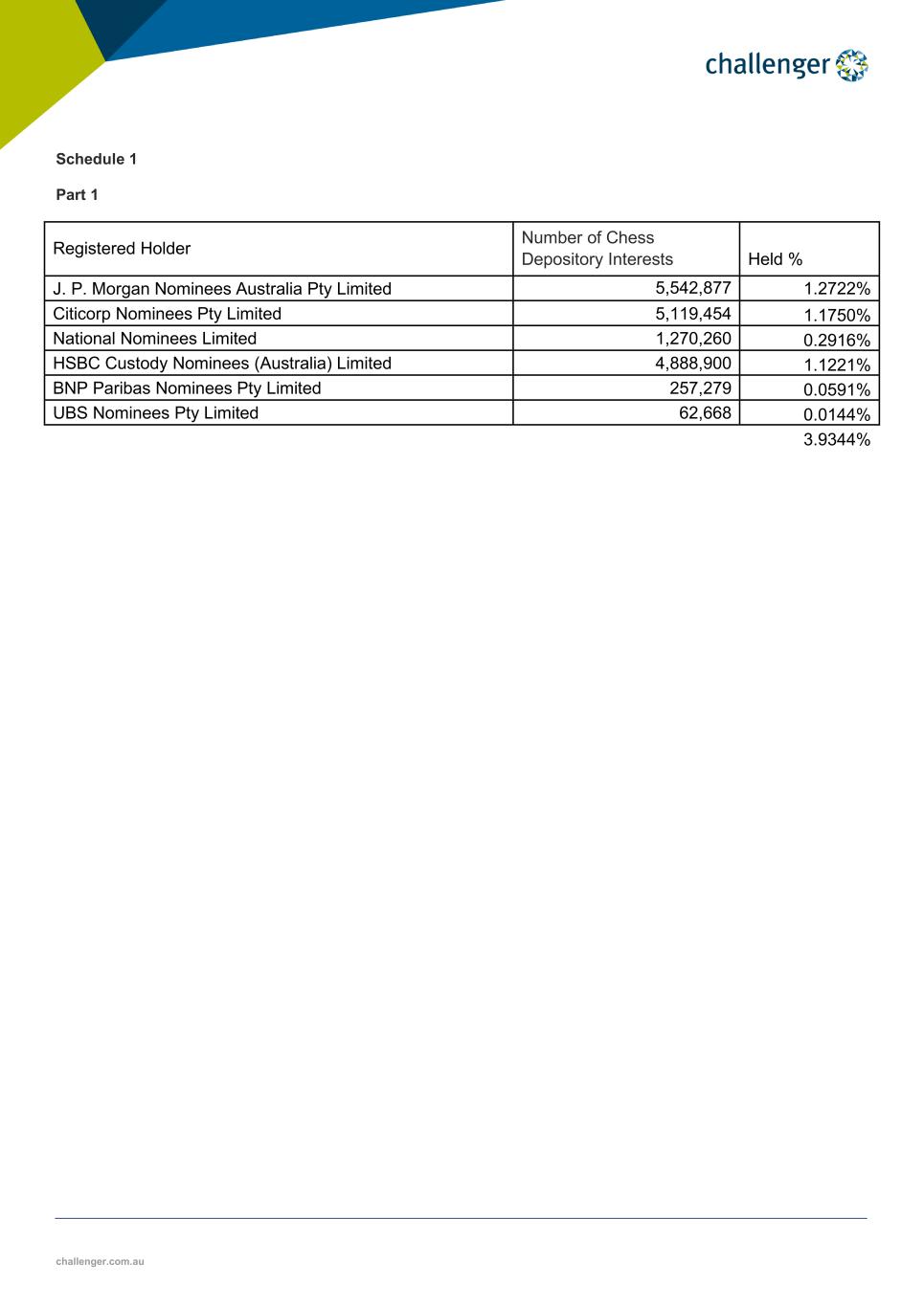 challenger.com.au Schedule 1 Part 1 Registered Holder Number of Chess Depository Interests Held % J. P. Morgan Nominees Australia Pty Limited 5,542,877 1.2722% Citicorp Nominees Pty Limited 5,119,454 1.1750% National Nominees Limited 1,270,260 0.2916% HSBC Custody Nominees (Australia) Limited 4,888,900 1.1221% BNP Paribas Nominees Pty Limited 257,279 0.0591% UBS Nominees Pty Limited 62,668 0.0144% 3.9344%