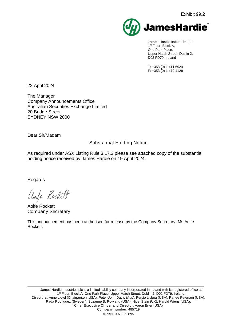 James Hardie Industries plc 1st Floor, Block A, One Park Place, Upper Hatch Street, Dublin 2, D02 FD79, Ireland T: +353 (0) 1 411 6924 F: +353 (0) 1 479 1128 James Hardie Industries plc is a limited liability company incorporated in Ireland with its registered office at 1st Floor, Block A, One Park Place, Upper Hatch Street, Dublin 2, D02 FD79, Ireland. Directors: Anne Lloyd (Chairperson, USA), Peter-John Davis (Aus), Persio Lisboa (USA), Renee Peterson (USA), Rada Rodriguez (Sweden), Suzanne B. Rowland (USA), Nigel Stein (UK), Harold Wiens (USA). Chief Executive Officer and Director: Aaron Erter (USA) Company number: 485719 ARBN: 097 829 895 22 April 2024 The Manager Company Announcements Office Australian Securities Exchange Limited 20 Bridge Street SYDNEY NSW 2000 Dear Sir/Madam Substantial Holding Notice As required under ASX Listing Rule 3.17.3 please see attached copy of the substantial holding notice received by James Hardie on 19 April 2024. Regards Aoife Rockett Company Secretary This announcement has been authorised for release by the Company Secretary, Ms Aoife Rockett. Exhibit 99.2