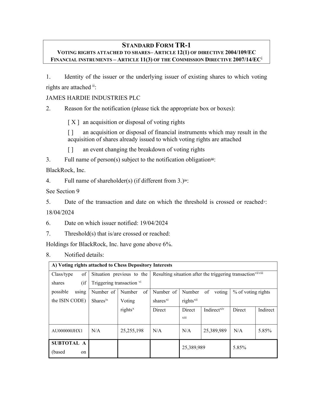 STANDARD FORM TR-1 VOTING RIGHTS ATTACHED TO SHARES– ARTICLE 12(1) OF DIRECTIVE 2004/109/EC FINANCIAL INSTRUMENTS – ARTICLE 11(3) OF THE COMMISSION DIRECTIVE 2007/14/ECi 1. Identity of the issuer or the underlying issuer of existing shares to which voting rights are attached ii: JAMES HARDIE INDUSTRIES PLC 2. Reason for the notification (please tick the appropriate box or boxes): [ X ] an acquisition or disposal of voting rights [ ] an acquisition or disposal of financial instruments which may result in the acquisition of shares already issued to which voting rights are attached [ ] an event changing the breakdown of voting rights 3. Full name of person(s) subject to the notification obligationiii: BlackRock, Inc. 4. Full name of shareholder(s) (if different from 3.) iv: See Section 9 5. Date of the transaction and date on which the threshold is crossed or reachedv: 18/04/2024 6. Date on which issuer notified: 19/04/2024 7. Threshold(s) that is/are crossed or reached: Holdings for BlackRock, Inc. have gone above 6%. 8. Notified details: A) Voting rights attached to Chess Depository Interests Class/type of shares (if possible using the ISIN CODE) Situation previous to the Triggering transaction vi Resulting situation after the triggering transactionviiviii Number of Sharesix Number of Voting rightsx Number of sharesxi Number of voting rightsxii % of voting rights Direct Direct xiii Indirectxiv Direct Indirect AU000000JHX1 N/A 25,255,198 N/A N/A 25,389,989 N/A 5.85% SUBTOTAL A (based on 25,389,989 5.85%