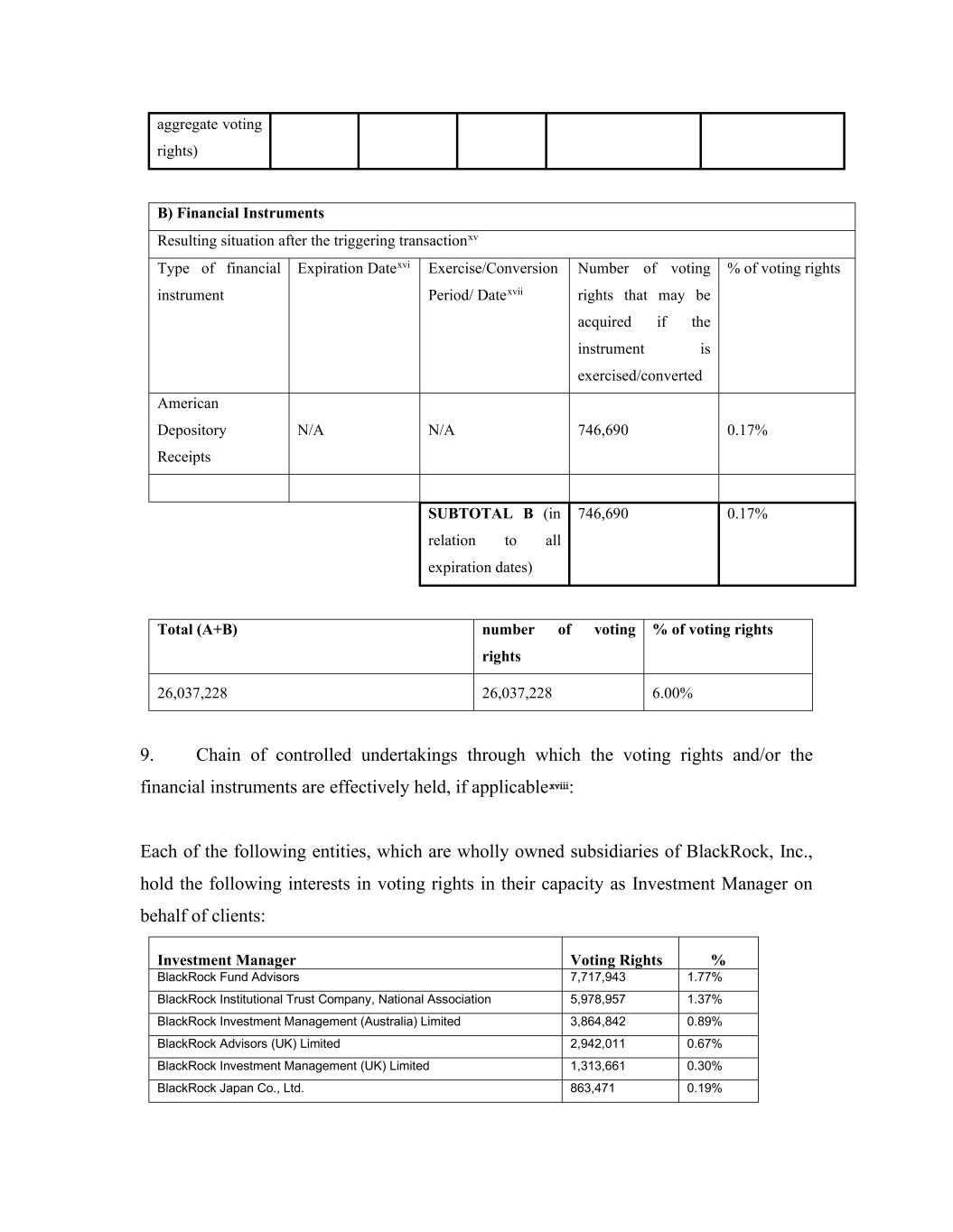 aggregate voting rights) B) Financial Instruments Resulting situation after the triggering transactionxv Type of financial instrument Expiration Datexvi Exercise/Conversion Period/ Datexvii Number of voting rights that may be acquired if the instrument is exercised/converted % of voting rights American Depository Receipts N/A N/A 746,690 0.17% SUBTOTAL B (in relation to all expiration dates) 746,690 0.17% Total (A+B) number of voting rights % of voting rights 26,037,228 26,037,228 6.00% 9. Chain of controlled undertakings through which the voting rights and/or the financial instruments are effectively held, if applicablexviii: Each of the following entities, which are wholly owned subsidiaries of BlackRock, Inc., hold the following interests in voting rights in their capacity as Investment Manager on behalf of clients: Investment Manager Voting Rights % BlackRock Fund Advisors 7,717,943 1.77% BlackRock Institutional Trust Company, National Association 5,978,957 1.37% BlackRock Investment Management (Australia) Limited 3,864,842 0.89% BlackRock Advisors (UK) Limited 2,942,011 0.67% BlackRock Investment Management (UK) Limited 1,313,661 0.30% BlackRock Japan Co., Ltd. 863,471 0.19%