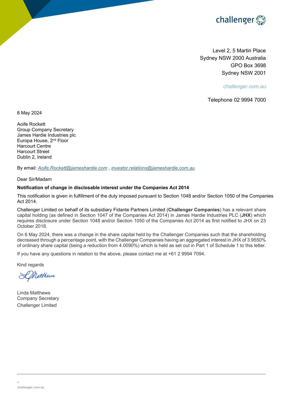 = challenger.com.au Level 2, 5 Martin Place Sydney NSW 2000 Australia GPO Box 3698 Sydney NSW 2001 challenger.com.au Telephone 02 9994 7000 8 May 2024 Aoife Rockett Group Company Secretary James Hardie Industries plc Europa House, 2nd Floor Harcourt Centre Harcourt Street Dublin 2, Ireland By email: Aoife.Rockett@jameshardie.com , investor.relations@jameshardie.com.au Dear Sir/Madam Notification of change in disclosable interest under the Companies Act 2014 This notification is given in fulfillment of the duty imposed pursuant to Section 1048 and/or Section 1050 of the Companies Act 2014. Challenger Limited on behalf of its subsidiary Fidante Partners Limited (Challenger Companies) has a relevant share capital holding (as defined in Section 1047 of the Companies Act 2014) in James Hardie Industries PLC (JHX) which requires disclosure under Section 1048 and/or Section 1050 of the Companies Act 2014 as first notified to JHX on 23 October 2018. On 6 May 2024, there was a change in the share capital held by the Challenger Companies such that the shareholding decreased through a percentage point, with the Challenger Companies having an aggregated interest in JHX of 3.9550% of ordinary share capital (being a reduction from 4.0090%) which is held as set out in Part 1 of Schedule 1 to this letter. If you have any questions in relation to the above, please contact me at +61 2 9994 7094. Kind regards Linda Matthews Company Secretary Challenger Limited