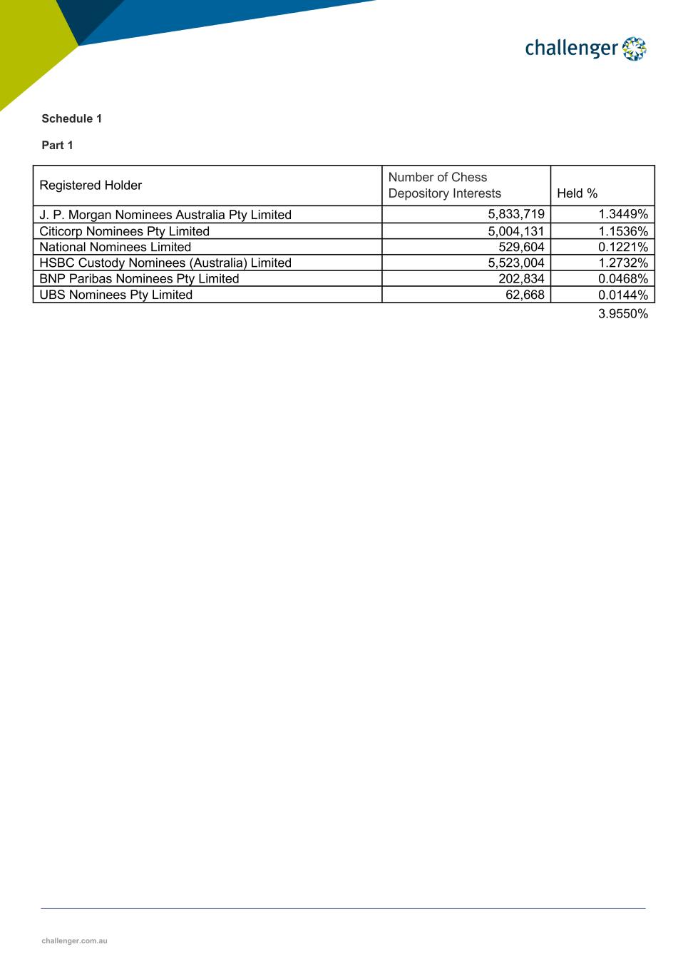 challenger.com.au Schedule 1 Part 1 Registered Holder Number of Chess Depository Interests Held % J. P. Morgan Nominees Australia Pty Limited 5,833,719 1.3449% Citicorp Nominees Pty Limited 5,004,131 1.1536% National Nominees Limited 529,604 0.1221% HSBC Custody Nominees (Australia) Limited 5,523,004 1.2732% BNP Paribas Nominees Pty Limited 202,834 0.0468% UBS Nominees Pty Limited 62,668 0.0144% 3.9550%