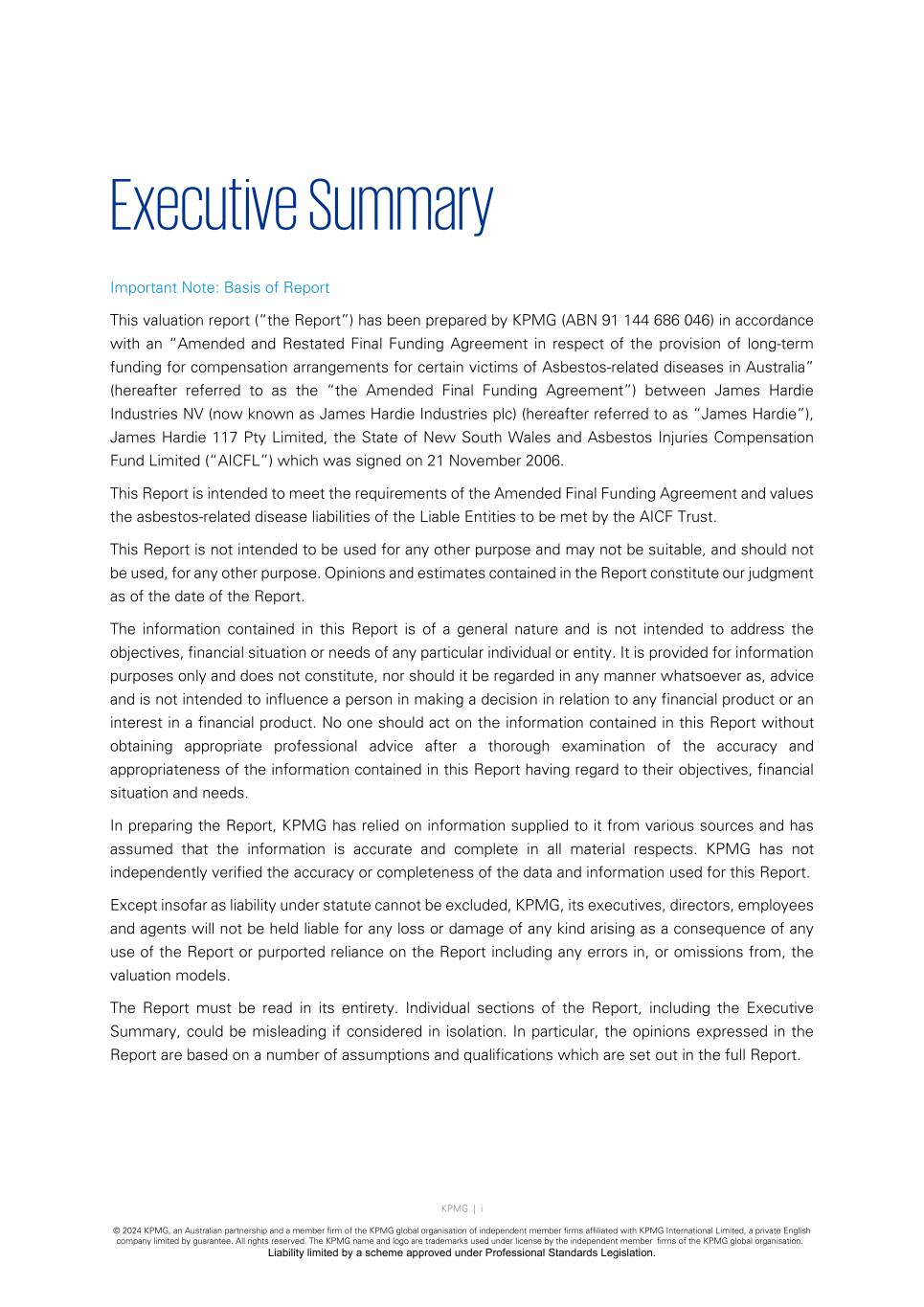KPMG | i © 2024 KPMG, an Australian partnership and a member firm of the KPMG global organisation of independent member firms affiliated with KPMG International Limited, a private English company limited by guarantee. All rights reserved. The KPMG name and logo are trademarks used under license by the independent member firms of the KPMG global organisation. Liability limited by a scheme approved under Professional Standards Legislation. Executive Summary Important Note: Basis of Report This valuation report (“the Report”) has been prepared by KPMG (ABN 91 144 686 046) in accordance with an “Amended and Restated Final Funding Agreement in respect of the provision of long-term funding for compensation arrangements for certain victims of Asbestos-related diseases in Australia” (hereafter referred to as the “the Amended Final Funding Agreement”) between James Hardie Industries NV (now known as James Hardie Industries plc) (hereafter referred to as “James Hardie”), James Hardie 117 Pty Limited, the State of New South Wales and Asbestos Injuries Compensation Fund Limited (“AICFL”) which was signed on 21 November 2006. This Report is intended to meet the requirements of the Amended Final Funding Agreement and values the asbestos-related disease liabilities of the Liable Entities to be met by the AICF Trust. This Report is not intended to be used for any other purpose and may not be suitable, and should not be used, for any other purpose. Opinions and estimates contained in the Report constitute our judgment as of the date of the Report. The information contained in this Report is of a general nature and is not intended to address the objectives, financial situation or needs of any particular individual or entity. It is provided for information purposes only and does not constitute, nor should it be regarded in any manner whatsoever as, advice and is not intended to influence a person in making a decision in relation to any financial product or an interest in a financial product. No one should act on the information contained in this Report without obtaining appropriate professional advice after a thorough examination of the accuracy and appropriateness of the information contained in this Report having regard to their objectives, financial situation and needs. In preparing the Report, KPMG has relied on information supplied to it from various sources and has assumed that the information is accurate and complete in all material respects. KPMG has not independently verified the accuracy or completeness of the data and information used for this Report. Except insofar as liability under statute cannot be excluded, KPMG, its executives, directors, employees and agents will not be held liable for any loss or damage of any kind arising as a consequence of any use of the Report or purported reliance on the Report including any errors in, or omissions from, the valuation models. The Report must be read in its entirety. Individual sections of the Report, including the Executive Summary, could be misleading if considered in isolation. In particular, the opinions expressed in the Report are based on a number of assumptions and qualifications which are set out in the full Report.
