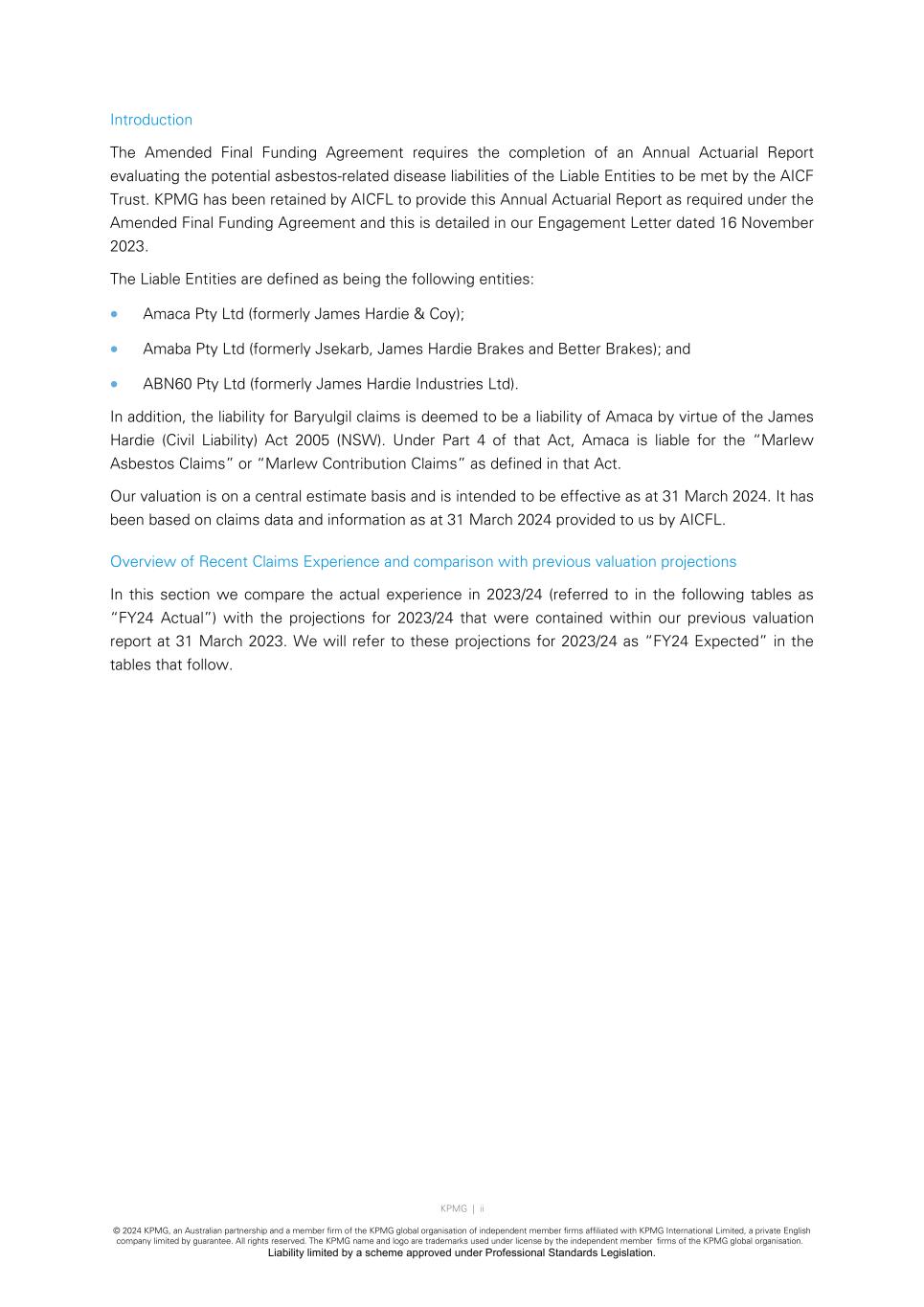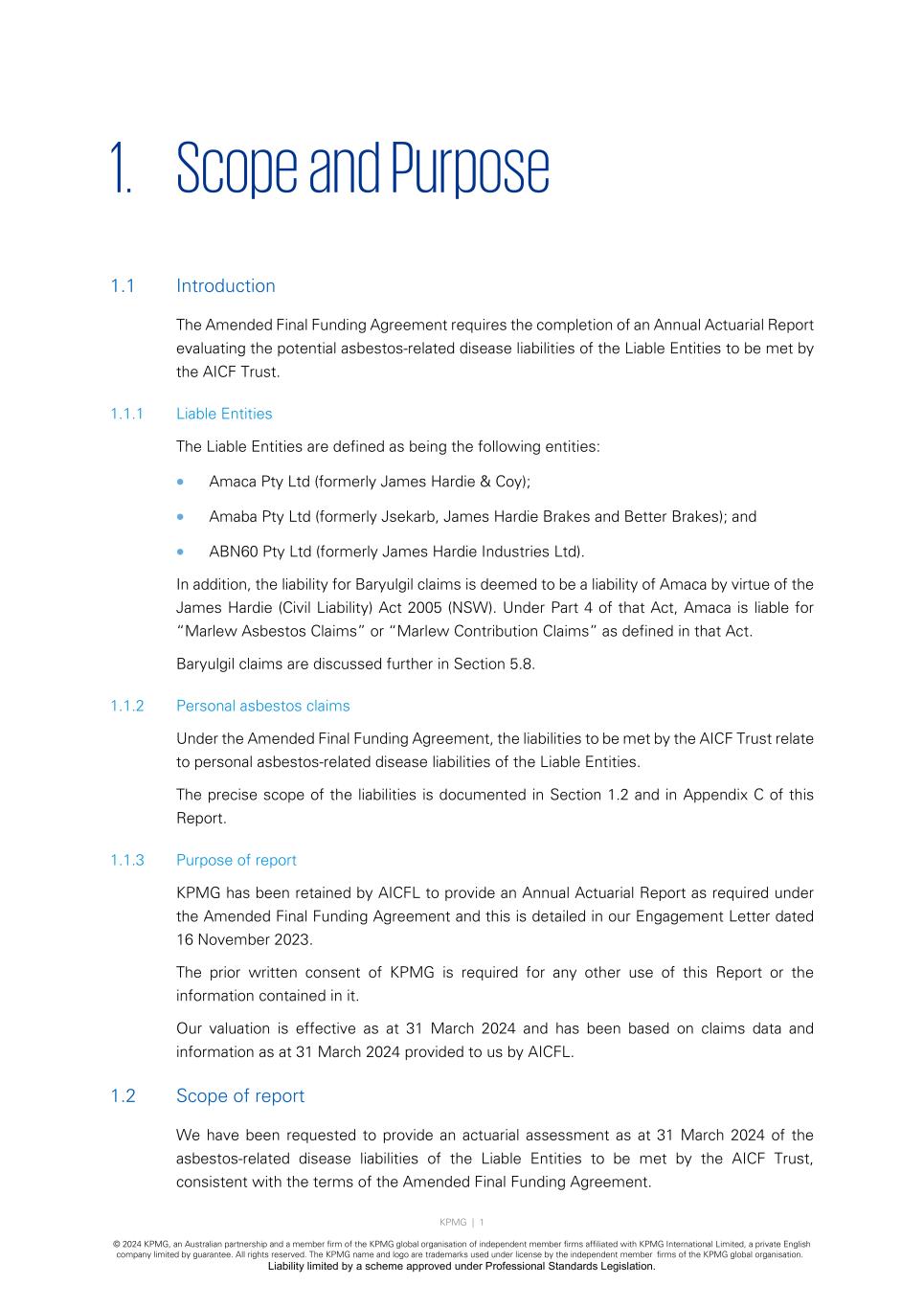 KPMG | 1 © 2024 KPMG, an Australian partnership and a member firm of the KPMG global organisation of independent member firms affiliated with KPMG International Limited, a private English company limited by guarantee. All rights reserved. The KPMG name and logo are trademarks used under license by the independent member firms of the KPMG global organisation. Liability limited by a scheme approved under Professional Standards Legislation. 1. Scope and Purpose 1.1 Introduction The Amended Final Funding Agreement requires the completion of an Annual Actuarial Report evaluating the potential asbestos-related disease liabilities of the Liable Entities to be met by the AICF Trust. 1.1.1 Liable Entities The Liable Entities are defined as being the following entities: • Amaca Pty Ltd (formerly James Hardie & Coy); • Amaba Pty Ltd (formerly Jsekarb, James Hardie Brakes and Better Brakes); and • ABN60 Pty Ltd (formerly James Hardie Industries Ltd). In addition, the liability for Baryulgil claims is deemed to be a liability of Amaca by virtue of the James Hardie (Civil Liability) Act 2005 (NSW). Under Part 4 of that Act, Amaca is liable for “Marlew Asbestos Claims” or “Marlew Contribution Claims” as defined in that Act. Baryulgil claims are discussed further in Section 5.8. 1.1.2 Personal asbestos claims Under the Amended Final Funding Agreement, the liabilities to be met by the AICF Trust relate to personal asbestos-related disease liabilities of the Liable Entities. The precise scope of the liabilities is documented in Section 1.2 and in Appendix C of this Report. 1.1.3 Purpose of report KPMG has been retained by AICFL to provide an Annual Actuarial Report as required under the Amended Final Funding Agreement and this is detailed in our Engagement Letter dated 16 November 2023. The prior written consent of KPMG is required for any other use of this Report or the information contained in it. Our valuation is effective as at 31 March 2024 and has been based on claims data and information as at 31 March 2024 provided to us by AICFL. 1.2 Scope of report We have been requested to provide an actuarial assessment as at 31 March 2024 of the asbestos-related disease liabilities of the Liable Entities to be met by the AICF Trust, consistent with the terms of the Amended Final Funding Agreement.