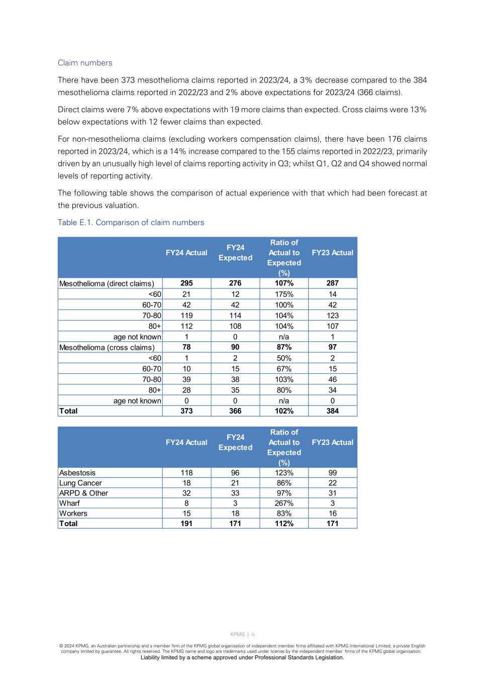 KPMG | iii © 2024 KPMG, an Australian partnership and a member firm of the KPMG global organisation of independent member firms affiliated with KPMG International Limited, a private English company limited by guarantee. All rights reserved. The KPMG name and logo are trademarks used under license by the independent member firms of the KPMG global organisation. Liability limited by a scheme approved under Professional Standards Legislation. Claim numbers There have been 373 mesothelioma claims reported in 2023/24, a 3% decrease compared to the 384 mesothelioma claims reported in 2022/23 and 2% above expectations for 2023/24 (366 claims). Direct claims were 7% above expectations with 19 more claims than expected. Cross claims were 13% below expectations with 12 fewer claims than expected. For non-mesothelioma claims (excluding workers compensation claims), there have been 176 claims reported in 2023/24, which is a 14% increase compared to the 155 claims reported in 2022/23, primarily driven by an unusually high level of claims reporting activity in Q3; whilst Q1, Q2 and Q4 showed normal levels of reporting activity. The following table shows the comparison of actual experience with that which had been forecast at the previous valuation. Table E.1. Comparison of claim numbers FY24 Actual FY24 Expected Ratio of Actual to Expected FY23 Actual (%) Mesothelioma (direct claims) 295 276 107% 287 <60 21 12 175% 14 60-70 42 42 100% 42 70-80 119 114 104% 123 80+ 112 108 104% 107 age not known 1 0 n/a 1 Mesothelioma (cross claims) 78 90 87% 97 <60 1 2 50% 2 60-70 10 15 67% 15 70-80 39 38 103% 46 80+ 28 35 80% 34 age not known 0 0 n/a 0 Total 373 366 102% 384 FY24 Actual FY24 Expected Ratio of Actual to Expected FY23 Actual (%) Asbestosis 118 96 123% 99 Lung Cancer 18 21 86% 22 ARPD & Other 32 33 97% 31 Wharf 8 3 267% 3 Workers 15 18 83% 16 Total 191 171 112% 171