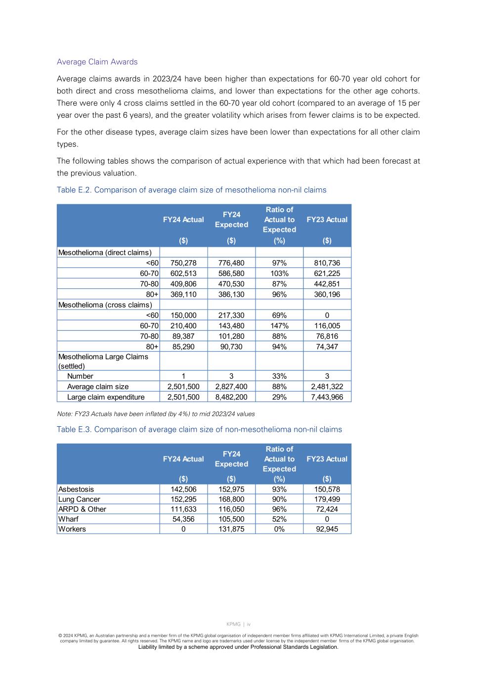 KPMG | iv © 2024 KPMG, an Australian partnership and a member firm of the KPMG global organisation of independent member firms affiliated with KPMG International Limited, a private English company limited by guarantee. All rights reserved. The KPMG name and logo are trademarks used under license by the independent member firms of the KPMG global organisation. Liability limited by a scheme approved under Professional Standards Legislation. Average Claim Awards Average claims awards in 2023/24 have been higher than expectations for 60-70 year old cohort for both direct and cross mesothelioma claims, and lower than expectations for the other age cohorts. There were only 4 cross claims settled in the 60-70 year old cohort (compared to an average of 15 per year over the past 6 years), and the greater volatility which arises from fewer claims is to be expected. For the other disease types, average claim sizes have been lower than expectations for all other claim types. The following tables shows the comparison of actual experience with that which had been forecast at the previous valuation. Table E.2. Comparison of average claim size of mesothelioma non-nil claims Note: FY23 Actuals have been inflated (by 4%) to mid 2023/24 values Table E.3. Comparison of average claim size of non-mesothelioma non-nil claims FY24 Actual FY24 Expected Ratio of Actual to Expected FY23 Actual ($) ($) (%) ($) Mesothelioma (direct claims) <60 750,278 776,480 97% 810,736 60-70 602,513 586,580 103% 621,225 70-80 409,806 470,530 87% 442,851 80+ 369,110 386,130 96% 360,196 Mesothelioma (cross claims) <60 150,000 217,330 69% 0 60-70 210,400 143,480 147% 116,005 70-80 89,387 101,280 88% 76,816 80+ 85,290 90,730 94% 74,347 Mesothelioma Large Claims (settled) Number 1 3 33% 3 Average claim size 2,501,500 2,827,400 88% 2,481,322 Large claim expenditure 2,501,500 8,482,200 29% 7,443,966 FY24 Actual FY24 Expected Ratio of Actual to Expected FY23 Actual ($) ($) (%) ($) Asbestosis 142,506 152,975 93% 150,578 Lung Cancer 152,295 168,800 90% 179,499 ARPD & Other 111,633 116,050 96% 72,424 Wharf 54,356 105,500 52% 0 Workers 0 131,875 0% 92,945