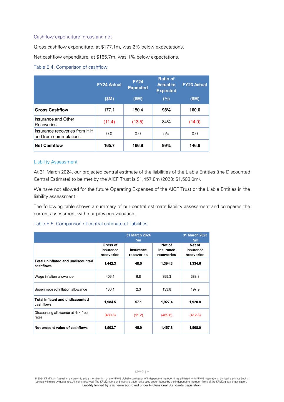 KPMG | v © 2024 KPMG, an Australian partnership and a member firm of the KPMG global organisation of independent member firms affiliated with KPMG International Limited, a private English company limited by guarantee. All rights reserved. The KPMG name and logo are trademarks used under license by the independent member firms of the KPMG global organisation. Liability limited by a scheme approved under Professional Standards Legislation. Cashflow expenditure: gross and net Gross cashflow expenditure, at $177.1m, was 2% below expectations. Net cashflow expenditure, at $165.7m, was 1% below expectations. Table E.4. Comparison of cashflow Liability Assessment At 31 March 2024, our projected central estimate of the liabilities of the Liable Entities (the Discounted Central Estimate) to be met by the AICF Trust is $1,457.8m (2023: $1,508.0m). We have not allowed for the future Operating Expenses of the AICF Trust or the Liable Entities in the liability assessment. The following table shows a summary of our central estimate liability assessment and compares the current assessment with our previous valuation. Table E.5. Comparison of central estimate of liabilities FY24 Actual FY24 Expected Ratio of Actual to Expected FY23 Actual ($M) ($M) (%) ($M) Gross Cashflow 177.1 180.4 98% 160.6 Insurance and Other Recoveries (11.4) (13.5) 84% (14.0) Insurance recoveries from HIH and from commutations 0.0 0.0 n/a 0.0 Net Cashflow 165.7 166.9 99% 146.6 31 March 2023 $m Gross of insurance recoveries Insurance recoveries Net of insurance recoveries Net of insurance recoveries Total uninflated and undiscounted cashflows 1,442.3 48.0 1,394.3 1,334.6 Wage inflation allowance 406.1 6.8 399.3 388.3 Superimposed inflation allowance 136.1 2.3 133.8 197.9 Total inflated and undiscounted cashflows 1,984.5 57.1 1,927.4 1,920.8 Discounting allowance at risk-free rates (480.8) (11.2) (469.6) (412.8) Net present value of cashflows 1,503.7 45.9 1,457.8 1,508.0 31 March 2024 $m