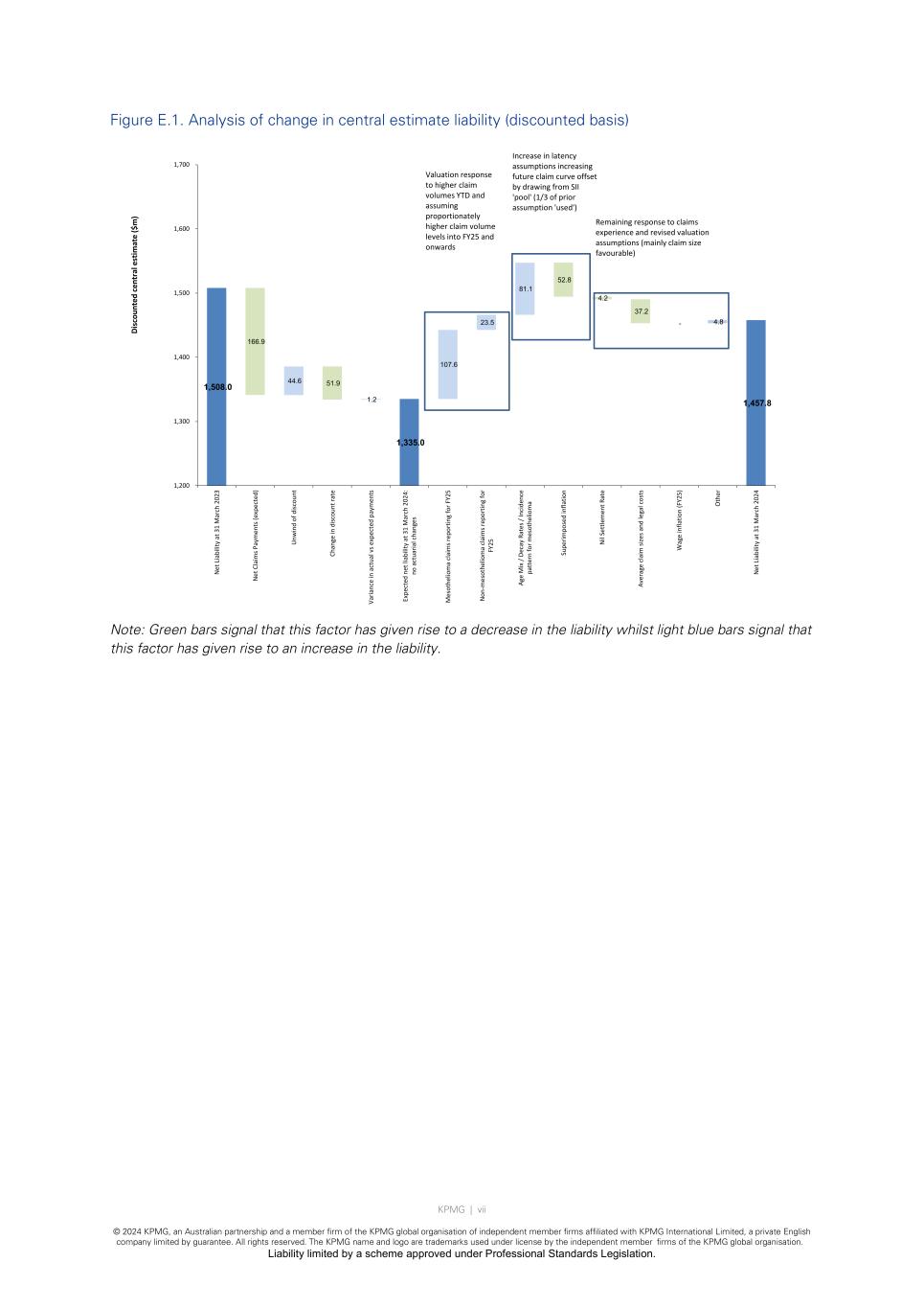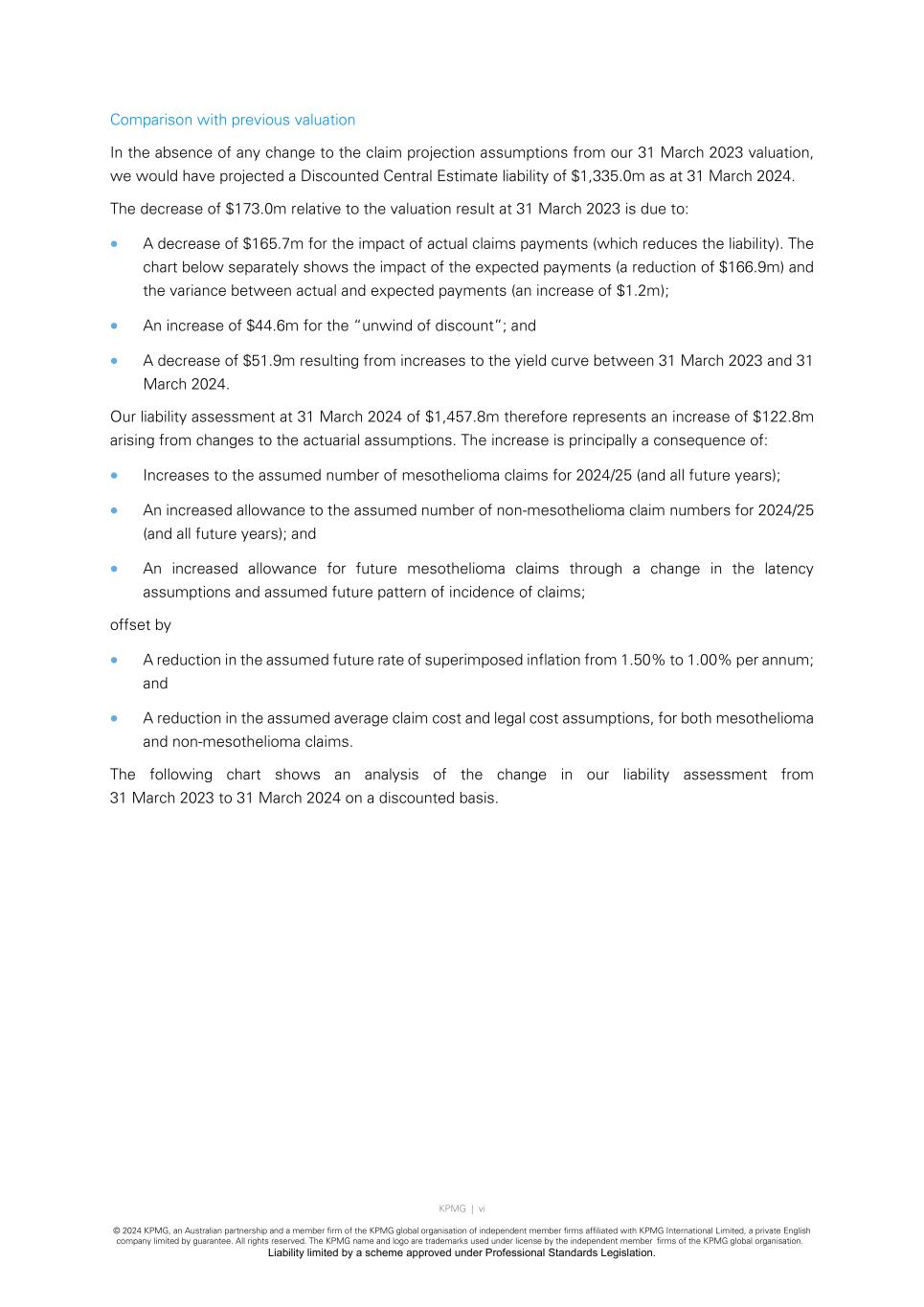 KPMG | vi © 2024 KPMG, an Australian partnership and a member firm of the KPMG global organisation of independent member firms affiliated with KPMG International Limited, a private English company limited by guarantee. All rights reserved. The KPMG name and logo are trademarks used under license by the independent member firms of the KPMG global organisation. Liability limited by a scheme approved under Professional Standards Legislation. Comparison with previous valuation In the absence of any change to the claim projection assumptions from our 31 March 2023 valuation, we would have projected a Discounted Central Estimate liability of $1,335.0m as at 31 March 2024. The decrease of $173.0m relative to the valuation result at 31 March 2023 is due to: • A decrease of $165.7m for the impact of actual claims payments (which reduces the liability). The chart below separately shows the impact of the expected payments (a reduction of $166.9m) and the variance between actual and expected payments (an increase of $1.2m); • An increase of $44.6m for the “unwind of discount”; and • A decrease of $51.9m resulting from increases to the yield curve between 31 March 2023 and 31 March 2024. Our liability assessment at 31 March 2024 of $1,457.8m therefore represents an increase of $122.8m arising from changes to the actuarial assumptions. The increase is principally a consequence of: • Increases to the assumed number of mesothelioma claims for 2024/25 (and all future years); • An increased allowance to the assumed number of non-mesothelioma claim numbers for 2024/25 (and all future years); and • An increased allowance for future mesothelioma claims through a change in the latency assumptions and assumed future pattern of incidence of claims; offset by • A reduction in the assumed future rate of superimposed inflation from 1.50% to 1.00% per annum; and • A reduction in the assumed average claim cost and legal cost assumptions, for both mesothelioma and non-mesothelioma claims. The following chart shows an analysis of the change in our liability assessment from 31 March 2023 to 31 March 2024 on a discounted basis.