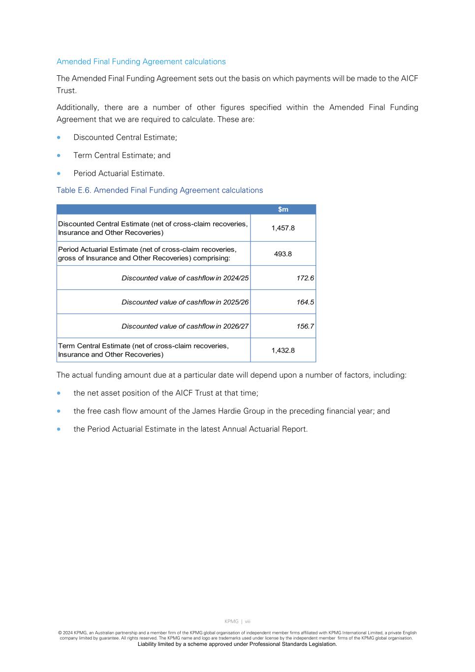 KPMG | viii © 2024 KPMG, an Australian partnership and a member firm of the KPMG global organisation of independent member firms affiliated with KPMG International Limited, a private English company limited by guarantee. All rights reserved. The KPMG name and logo are trademarks used under license by the independent member firms of the KPMG global organisation. Liability limited by a scheme approved under Professional Standards Legislation. Amended Final Funding Agreement calculations The Amended Final Funding Agreement sets out the basis on which payments will be made to the AICF Trust. Additionally, there are a number of other figures specified within the Amended Final Funding Agreement that we are required to calculate. These are: • Discounted Central Estimate; • Term Central Estimate; and • Period Actuarial Estimate. Table E.6. Amended Final Funding Agreement calculations The actual funding amount due at a particular date will depend upon a number of factors, including: • the net asset position of the AICF Trust at that time; • the free cash flow amount of the James Hardie Group in the preceding financial year; and • the Period Actuarial Estimate in the latest Annual Actuarial Report. $m Discounted Central Estimate (net of cross-claim recoveries, Insurance and Other Recoveries) 1,457.8 Period Actuarial Estimate (net of cross-claim recoveries, gross of Insurance and Other Recoveries) comprising: 493.8 Discounted value of cashflow in 2024/25 172.6 Discounted value of cashflow in 2025/26 164.5 Discounted value of cashflow in 2026/27 156.7 Term Central Estimate (net of cross-claim recoveries, Insurance and Other Recoveries) 1,432.8