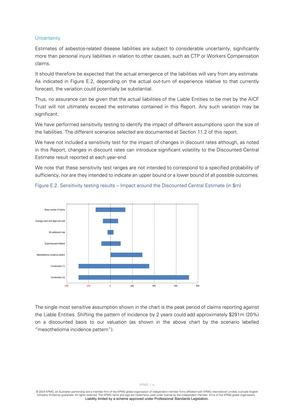 KPMG | ix © 2024 KPMG, an Australian partnership and a member firm of the KPMG global organisation of independent member firms affiliated with KPMG International Limited, a private English company limited by guarantee. All rights reserved. The KPMG name and logo are trademarks used under license by the independent member firms of the KPMG global organisation. Liability limited by a scheme approved under Professional Standards Legislation. Uncertainty Estimates of asbestos-related disease liabilities are subject to considerable uncertainty, significantly more than personal injury liabilities in relation to other causes, such as CTP or Workers Compensation claims. It should therefore be expected that the actual emergence of the liabilities will vary from any estimate. As indicated in Figure E.2, depending on the actual out-turn of experience relative to that currently forecast, the variation could potentially be substantial. Thus, no assurance can be given that the actual liabilities of the Liable Entities to be met by the AICF Trust will not ultimately exceed the estimates contained in this Report. Any such variation may be significant. We have performed sensitivity testing to identify the impact of different assumptions upon the size of the liabilities. The different scenarios selected are documented at Section 11.2 of this report. We have not included a sensitivity test for the impact of changes in discount rates although, as noted in this Report, changes in discount rates can introduce significant volatility to the Discounted Central Estimate result reported at each year-end. We note that these sensitivity test ranges are not intended to correspond to a specified probability of sufficiency, nor are they intended to indicate an upper bound or a lower bound of all possible outcomes. Figure E.2. Sensitivity testing results – Impact around the Discounted Central Estimate (in $m) The single most sensitive assumption shown in the chart is the peak period of claims reporting against the Liable Entities. Shifting the pattern of incidence by 2 years could add approximately $291m (20%) on a discounted basis to our valuation (as shown in the above chart by the scenario labelled “mesothelioma incidence pattern”). -400 -200 0 200 400 600 800 Base number of claims Average claim and legal cost size Nil settlement rate Superimposed inflation Mesothelioma incidence pattern Combination (1) Combination (2)