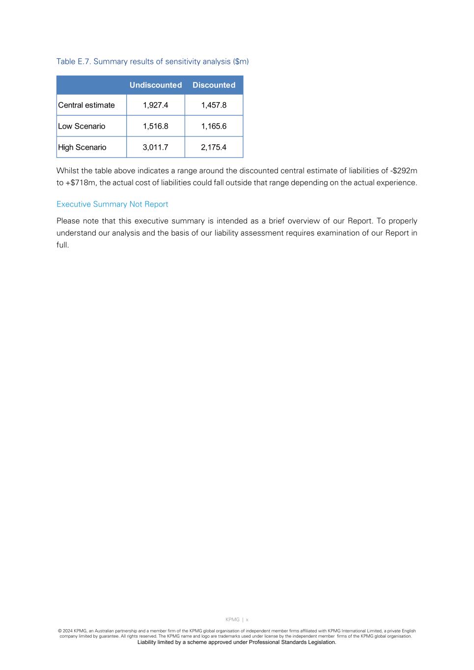 KPMG | x © 2024 KPMG, an Australian partnership and a member firm of the KPMG global organisation of independent member firms affiliated with KPMG International Limited, a private English company limited by guarantee. All rights reserved. The KPMG name and logo are trademarks used under license by the independent member firms of the KPMG global organisation. Liability limited by a scheme approved under Professional Standards Legislation. Table E.7. Summary results of sensitivity analysis ($m) Whilst the table above indicates a range around the discounted central estimate of liabilities of -$292m to +$718m, the actual cost of liabilities could fall outside that range depending on the actual experience. Executive Summary Not Report Please note that this executive summary is intended as a brief overview of our Report. To properly understand our analysis and the basis of our liability assessment requires examination of our Report in full. Undiscounted Discounted Central estimate 1,927.4 1,457.8 Low Scenario 1,516.8 1,165.6 High Scenario 3,011.7 2,175.4