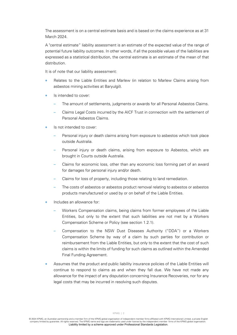 KPMG | 2 © 2024 KPMG, an Australian partnership and a member firm of the KPMG global organisation of independent member firms affiliated with KPMG International Limited, a private English company limited by guarantee. All rights reserved. The KPMG name and logo are trademarks used under license by the independent member firms of the KPMG global organisation. Liability limited by a scheme approved under Professional Standards Legislation. The assessment is on a central estimate basis and is based on the claims experience as at 31 March 2024. A "central estimate” liability assessment is an estimate of the expected value of the range of potential future liability outcomes. In other words, if all the possible values of the liabilities are expressed as a statistical distribution, the central estimate is an estimate of the mean of that distribution. It is of note that our liability assessment: • Relates to the Liable Entities and Marlew (in relation to Marlew Claims arising from asbestos mining activities at Baryulgil). • Is intended to cover: – The amount of settlements, judgments or awards for all Personal Asbestos Claims. – Claims Legal Costs incurred by the AICF Trust in connection with the settlement of Personal Asbestos Claims. • Is not intended to cover: – Personal injury or death claims arising from exposure to asbestos which took place outside Australia. – Personal injury or death claims, arising from exposure to Asbestos, which are brought in Courts outside Australia. – Claims for economic loss, other than any economic loss forming part of an award for damages for personal injury and/or death. – Claims for loss of property, including those relating to land remediation. – The costs of asbestos or asbestos product removal relating to asbestos or asbestos products manufactured or used by or on behalf of the Liable Entities. • Includes an allowance for: – Workers Compensation claims, being claims from former employees of the Liable Entities, but only to the extent that such liabilities are not met by a Workers Compensation Scheme or Policy (see section 1.2.1). – Compensation to the NSW Dust Diseases Authority (“DDA”) or a Workers Compensation Scheme by way of a claim by such parties for contribution or reimbursement from the Liable Entities, but only to the extent that the cost of such claims is within the limits of funding for such claims as outlined within the Amended Final Funding Agreement. • Assumes that the product and public liability insurance policies of the Liable Entities will continue to respond to claims as and when they fall due. We have not made any allowance for the impact of any disputation concerning Insurance Recoveries, nor for any legal costs that may be incurred in resolving such disputes.