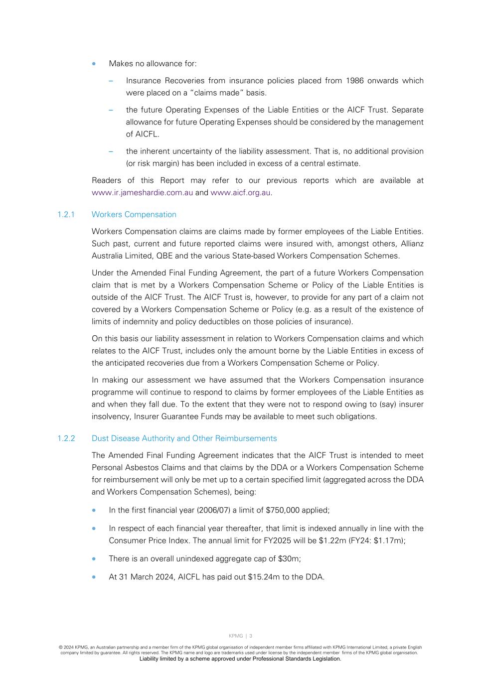 KPMG | 3 © 2024 KPMG, an Australian partnership and a member firm of the KPMG global organisation of independent member firms affiliated with KPMG International Limited, a private English company limited by guarantee. All rights reserved. The KPMG name and logo are trademarks used under license by the independent member firms of the KPMG global organisation. Liability limited by a scheme approved under Professional Standards Legislation. • Makes no allowance for: – Insurance Recoveries from insurance policies placed from 1986 onwards which were placed on a “claims made” basis. – the future Operating Expenses of the Liable Entities or the AICF Trust. Separate allowance for future Operating Expenses should be considered by the management of AICFL. – the inherent uncertainty of the liability assessment. That is, no additional provision (or risk margin) has been included in excess of a central estimate. Readers of this Report may refer to our previous reports which are available at www.ir.jameshardie.com.au and www.aicf.org.au. 1.2.1 Workers Compensation Workers Compensation claims are claims made by former employees of the Liable Entities. Such past, current and future reported claims were insured with, amongst others, Allianz Australia Limited, QBE and the various State-based Workers Compensation Schemes. Under the Amended Final Funding Agreement, the part of a future Workers Compensation claim that is met by a Workers Compensation Scheme or Policy of the Liable Entities is outside of the AICF Trust. The AICF Trust is, however, to provide for any part of a claim not covered by a Workers Compensation Scheme or Policy (e.g. as a result of the existence of limits of indemnity and policy deductibles on those policies of insurance). On this basis our liability assessment in relation to Workers Compensation claims and which relates to the AICF Trust, includes only the amount borne by the Liable Entities in excess of the anticipated recoveries due from a Workers Compensation Scheme or Policy. In making our assessment we have assumed that the Workers Compensation insurance programme will continue to respond to claims by former employees of the Liable Entities as and when they fall due. To the extent that they were not to respond owing to (say) insurer insolvency, Insurer Guarantee Funds may be available to meet such obligations. 1.2.2 Dust Disease Authority and Other Reimbursements The Amended Final Funding Agreement indicates that the AICF Trust is intended to meet Personal Asbestos Claims and that claims by the DDA or a Workers Compensation Scheme for reimbursement will only be met up to a certain specified limit (aggregated across the DDA and Workers Compensation Schemes), being: • In the first financial year (2006/07) a limit of $750,000 applied; • In respect of each financial year thereafter, that limit is indexed annually in line with the Consumer Price Index. The annual limit for FY2025 will be $1.22m (FY24: $1.17m); • There is an overall unindexed aggregate cap of $30m; • At 31 March 2024, AICFL has paid out $15.24m to the DDA.