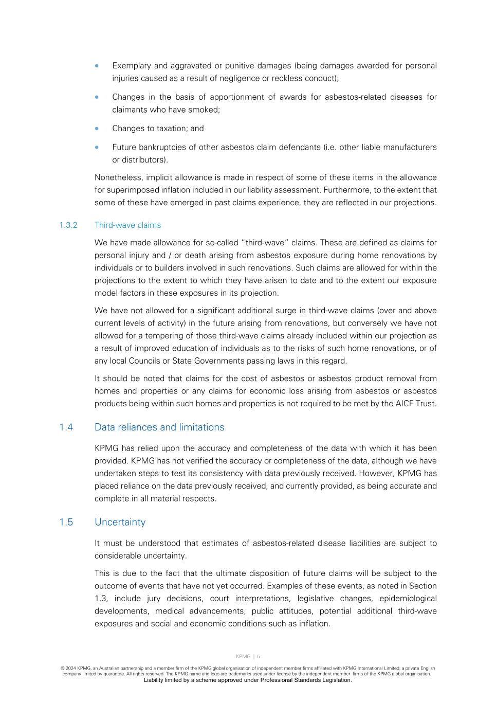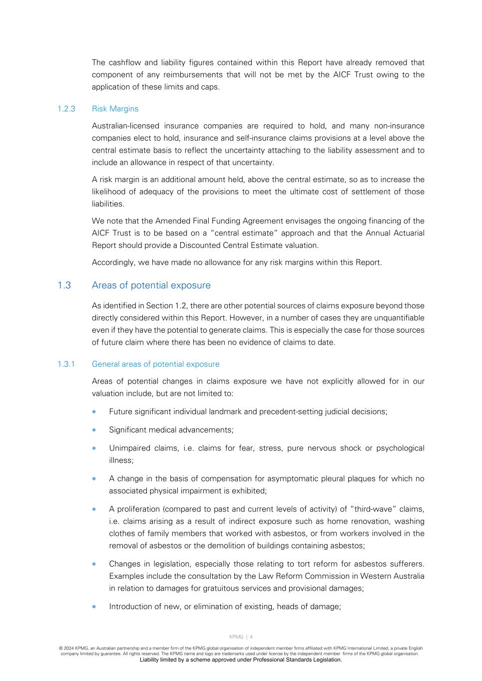 KPMG | 4 © 2024 KPMG, an Australian partnership and a member firm of the KPMG global organisation of independent member firms affiliated with KPMG International Limited, a private English company limited by guarantee. All rights reserved. The KPMG name and logo are trademarks used under license by the independent member firms of the KPMG global organisation. Liability limited by a scheme approved under Professional Standards Legislation. The cashflow and liability figures contained within this Report have already removed that component of any reimbursements that will not be met by the AICF Trust owing to the application of these limits and caps. 1.2.3 Risk Margins Australian-licensed insurance companies are required to hold, and many non-insurance companies elect to hold, insurance and self-insurance claims provisions at a level above the central estimate basis to reflect the uncertainty attaching to the liability assessment and to include an allowance in respect of that uncertainty. A risk margin is an additional amount held, above the central estimate, so as to increase the likelihood of adequacy of the provisions to meet the ultimate cost of settlement of those liabilities. We note that the Amended Final Funding Agreement envisages the ongoing financing of the AICF Trust is to be based on a “central estimate” approach and that the Annual Actuarial Report should provide a Discounted Central Estimate valuation. Accordingly, we have made no allowance for any risk margins within this Report. 1.3 Areas of potential exposure As identified in Section 1.2, there are other potential sources of claims exposure beyond those directly considered within this Report. However, in a number of cases they are unquantifiable even if they have the potential to generate claims. This is especially the case for those sources of future claim where there has been no evidence of claims to date. 1.3.1 General areas of potential exposure Areas of potential changes in claims exposure we have not explicitly allowed for in our valuation include, but are not limited to: • Future significant individual landmark and precedent-setting judicial decisions; • Significant medical advancements; • Unimpaired claims, i.e. claims for fear, stress, pure nervous shock or psychological illness; • A change in the basis of compensation for asymptomatic pleural plaques for which no associated physical impairment is exhibited; • A proliferation (compared to past and current levels of activity) of “third-wave” claims, i.e. claims arising as a result of indirect exposure such as home renovation, washing clothes of family members that worked with asbestos, or from workers involved in the removal of asbestos or the demolition of buildings containing asbestos; • Changes in legislation, especially those relating to tort reform for asbestos sufferers. Examples include the consultation by the Law Reform Commission in Western Australia in relation to damages for gratuitous services and provisional damages; • Introduction of new, or elimination of existing, heads of damage;