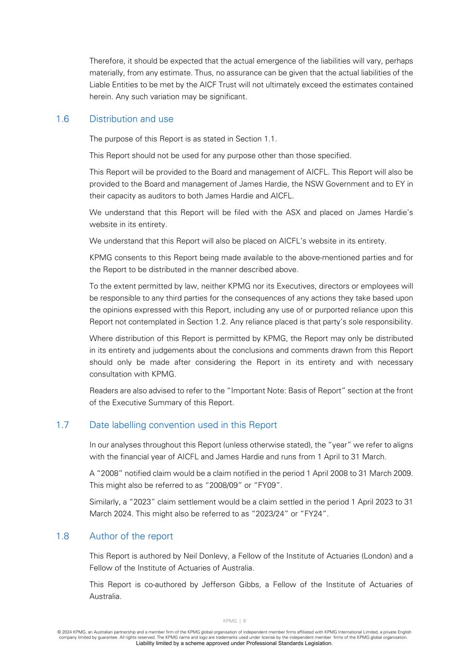 KPMG | 6 © 2024 KPMG, an Australian partnership and a member firm of the KPMG global organisation of independent member firms affiliated with KPMG International Limited, a private English company limited by guarantee. All rights reserved. The KPMG name and logo are trademarks used under license by the independent member firms of the KPMG global organisation. Liability limited by a scheme approved under Professional Standards Legislation. Therefore, it should be expected that the actual emergence of the liabilities will vary, perhaps materially, from any estimate. Thus, no assurance can be given that the actual liabilities of the Liable Entities to be met by the AICF Trust will not ultimately exceed the estimates contained herein. Any such variation may be significant. 1.6 Distribution and use The purpose of this Report is as stated in Section 1.1. This Report should not be used for any purpose other than those specified. This Report will be provided to the Board and management of AICFL. This Report will also be provided to the Board and management of James Hardie, the NSW Government and to EY in their capacity as auditors to both James Hardie and AICFL. We understand that this Report will be filed with the ASX and placed on James Hardie’s website in its entirety. We understand that this Report will also be placed on AICFL’s website in its entirety. KPMG consents to this Report being made available to the above-mentioned parties and for the Report to be distributed in the manner described above. To the extent permitted by law, neither KPMG nor its Executives, directors or employees will be responsible to any third parties for the consequences of any actions they take based upon the opinions expressed with this Report, including any use of or purported reliance upon this Report not contemplated in Section 1.2. Any reliance placed is that party’s sole responsibility. Where distribution of this Report is permitted by KPMG, the Report may only be distributed in its entirety and judgements about the conclusions and comments drawn from this Report should only be made after considering the Report in its entirety and with necessary consultation with KPMG. Readers are also advised to refer to the “Important Note: Basis of Report” section at the front of the Executive Summary of this Report. 1.7 Date labelling convention used in this Report In our analyses throughout this Report (unless otherwise stated), the “year” we refer to aligns with the financial year of AICFL and James Hardie and runs from 1 April to 31 March. A “2008” notified claim would be a claim notified in the period 1 April 2008 to 31 March 2009. This might also be referred to as “2008/09” or “FY09”. Similarly, a “2023” claim settlement would be a claim settled in the period 1 April 2023 to 31 March 2024. This might also be referred to as “2023/24” or “FY24”. 1.8 Author of the report This Report is authored by Neil Donlevy, a Fellow of the Institute of Actuaries (London) and a Fellow of the Institute of Actuaries of Australia. This Report is co-authored by Jefferson Gibbs, a Fellow of the Institute of Actuaries of Australia.