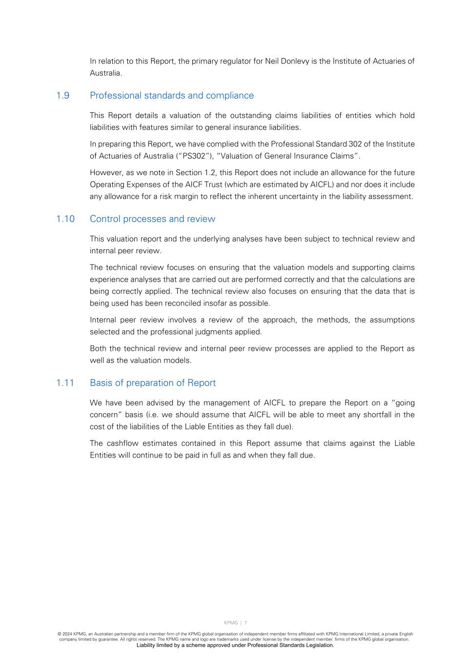 KPMG | 7 © 2024 KPMG, an Australian partnership and a member firm of the KPMG global organisation of independent member firms affiliated with KPMG International Limited, a private English company limited by guarantee. All rights reserved. The KPMG name and logo are trademarks used under license by the independent member firms of the KPMG global organisation. Liability limited by a scheme approved under Professional Standards Legislation. In relation to this Report, the primary regulator for Neil Donlevy is the Institute of Actuaries of Australia. 1.9 Professional standards and compliance This Report details a valuation of the outstanding claims liabilities of entities which hold liabilities with features similar to general insurance liabilities. In preparing this Report, we have complied with the Professional Standard 302 of the Institute of Actuaries of Australia (“PS302”), “Valuation of General Insurance Claims”. However, as we note in Section 1.2, this Report does not include an allowance for the future Operating Expenses of the AICF Trust (which are estimated by AICFL) and nor does it include any allowance for a risk margin to reflect the inherent uncertainty in the liability assessment. 1.10 Control processes and review This valuation report and the underlying analyses have been subject to technical review and internal peer review. The technical review focuses on ensuring that the valuation models and supporting claims experience analyses that are carried out are performed correctly and that the calculations are being correctly applied. The technical review also focuses on ensuring that the data that is being used has been reconciled insofar as possible. Internal peer review involves a review of the approach, the methods, the assumptions selected and the professional judgments applied. Both the technical review and internal peer review processes are applied to the Report as well as the valuation models. 1.11 Basis of preparation of Report We have been advised by the management of AICFL to prepare the Report on a “going concern” basis (i.e. we should assume that AICFL will be able to meet any shortfall in the cost of the liabilities of the Liable Entities as they fall due). The cashflow estimates contained in this Report assume that claims against the Liable Entities will continue to be paid in full as and when they fall due.