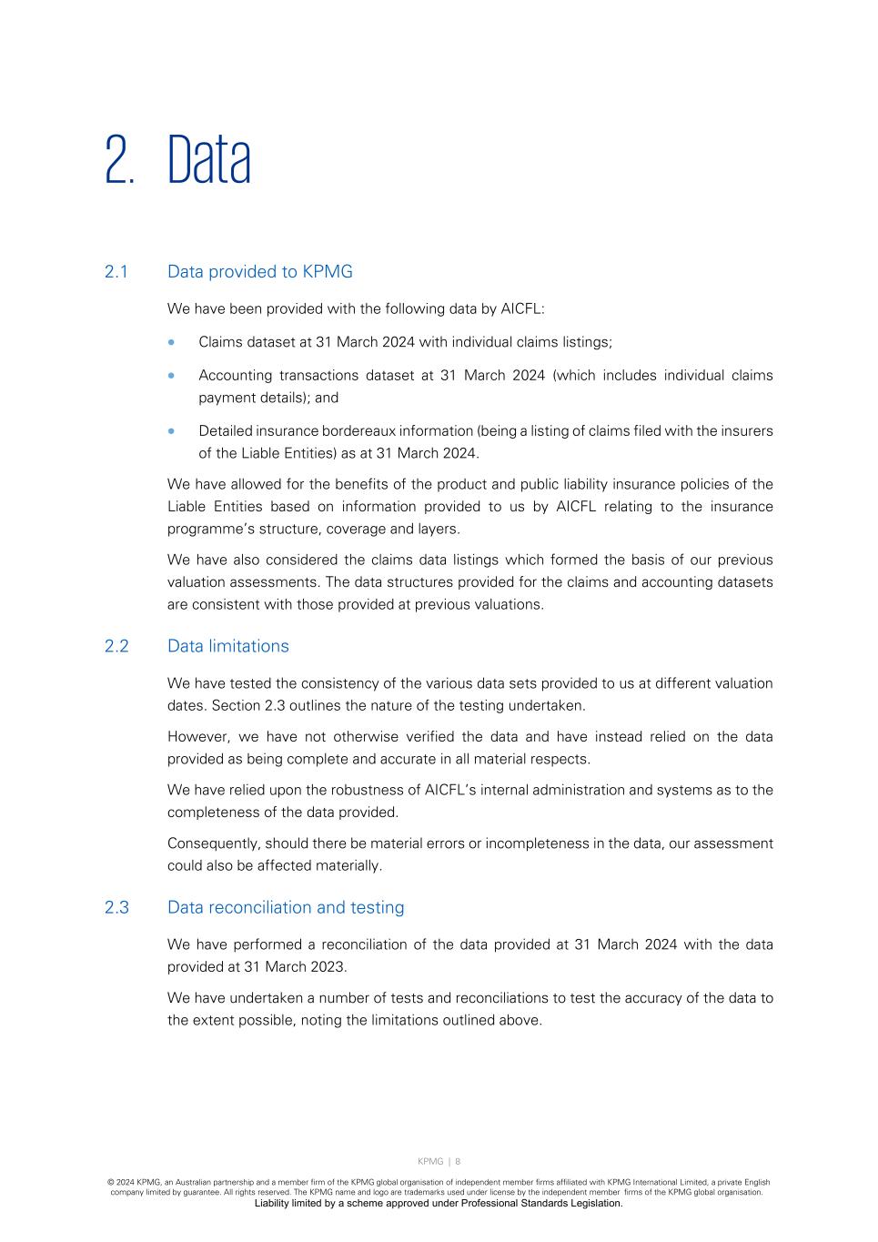 KPMG | 8 © 2024 KPMG, an Australian partnership and a member firm of the KPMG global organisation of independent member firms affiliated with KPMG International Limited, a private English company limited by guarantee. All rights reserved. The KPMG name and logo are trademarks used under license by the independent member firms of the KPMG global organisation. Liability limited by a scheme approved under Professional Standards Legislation. 2. Data 2.1 Data provided to KPMG We have been provided with the following data by AICFL: • Claims dataset at 31 March 2024 with individual claims listings; • Accounting transactions dataset at 31 March 2024 (which includes individual claims payment details); and • Detailed insurance bordereaux information (being a listing of claims filed with the insurers of the Liable Entities) as at 31 March 2024. We have allowed for the benefits of the product and public liability insurance policies of the Liable Entities based on information provided to us by AICFL relating to the insurance programme’s structure, coverage and layers. We have also considered the claims data listings which formed the basis of our previous valuation assessments. The data structures provided for the claims and accounting datasets are consistent with those provided at previous valuations. 2.2 Data limitations We have tested the consistency of the various data sets provided to us at different valuation dates. Section 2.3 outlines the nature of the testing undertaken. However, we have not otherwise verified the data and have instead relied on the data provided as being complete and accurate in all material respects. We have relied upon the robustness of AICFL’s internal administration and systems as to the completeness of the data provided. Consequently, should there be material errors or incompleteness in the data, our assessment could also be affected materially. 2.3 Data reconciliation and testing We have performed a reconciliation of the data provided at 31 March 2024 with the data provided at 31 March 2023. We have undertaken a number of tests and reconciliations to test the accuracy of the data to the extent possible, noting the limitations outlined above.