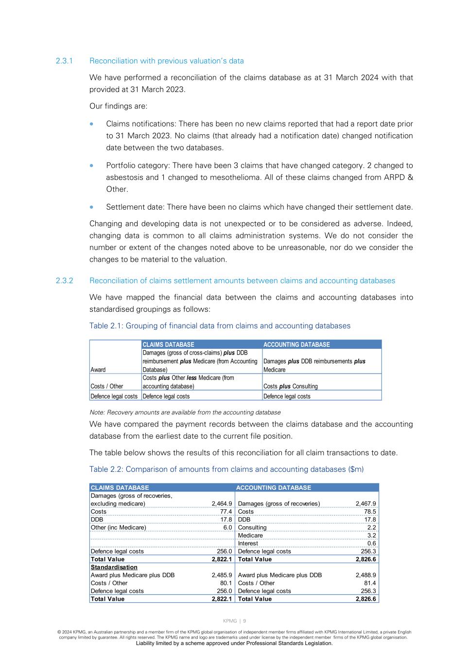 KPMG | 9 © 2024 KPMG, an Australian partnership and a member firm of the KPMG global organisation of independent member firms affiliated with KPMG International Limited, a private English company limited by guarantee. All rights reserved. The KPMG name and logo are trademarks used under license by the independent member firms of the KPMG global organisation. Liability limited by a scheme approved under Professional Standards Legislation. 2.3.1 Reconciliation with previous valuation’s data We have performed a reconciliation of the claims database as at 31 March 2024 with that provided at 31 March 2023. Our findings are: • Claims notifications: There has been no new claims reported that had a report date prior to 31 March 2023. No claims (that already had a notification date) changed notification date between the two databases. • Portfolio category: There have been 3 claims that have changed category. 2 changed to asbestosis and 1 changed to mesothelioma. All of these claims changed from ARPD & Other. • Settlement date: There have been no claims which have changed their settlement date. Changing and developing data is not unexpected or to be considered as adverse. Indeed, changing data is common to all claims administration systems. We do not consider the number or extent of the changes noted above to be unreasonable, nor do we consider the changes to be material to the valuation. 2.3.2 Reconciliation of claims settlement amounts between claims and accounting databases We have mapped the financial data between the claims and accounting databases into standardised groupings as follows: Table 2.1: Grouping of financial data from claims and accounting databases Note: Recovery amounts are available from the accounting database We have compared the payment records between the claims database and the accounting database from the earliest date to the current file position. The table below shows the results of this reconciliation for all claim transactions to date. Table 2.2: Comparison of amounts from claims and accounting databases ($m) CLAIMS DATABASE ACCOUNTING DATABASE Award Costs / Other Defence legal costs Defence legal costs Defence legal costs Damages (gross of cross-claims) plus DDB reimbursement plus Medicare (from Accounting Database) Damages plus DDB reimbursements plus Medicare Costs plus Other less Medicare (from accounting database) Costs plus Consulting CLAIMS DATABASE ACCOUNTING DATABASE Damages (gross of recoveries, excluding medicare) 2,464.9 Damages (gross of recoveries) 2,467.9 Costs 77.4 Costs 78.5 DDB 17.8 DDB 17.8 Other (inc Medicare) 6.0 Consulting 2.2 Medicare 3.2 Interest 0.6 Defence legal costs 256.0 Defence legal costs 256.3 Total Value 2,822.1 Total Value 2,826.6 Standardisation Award plus Medicare plus DDB 2,485.9 Award plus Medicare plus DDB 2,488.9 Costs / Other 80.1 Costs / Other 81.4 Defence legal costs 256.0 Defence legal costs 256.3 Total Value 2,822.1 Total Value 2,826.6