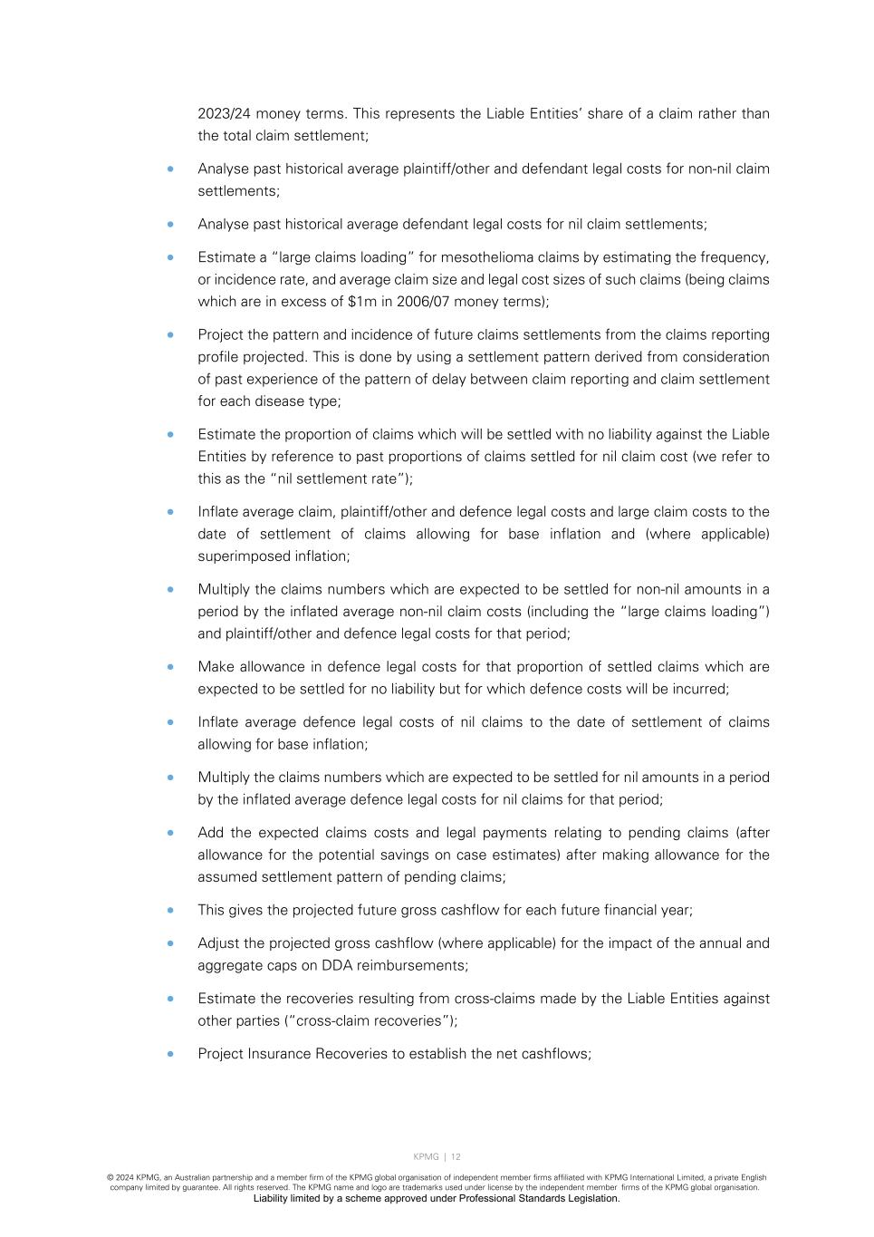 KPMG | 12 © 2024 KPMG, an Australian partnership and a member firm of the KPMG global organisation of independent member firms affiliated with KPMG International Limited, a private English company limited by guarantee. All rights reserved. The KPMG name and logo are trademarks used under license by the independent member firms of the KPMG global organisation. Liability limited by a scheme approved under Professional Standards Legislation. 2023/24 money terms. This represents the Liable Entities’ share of a claim rather than the total claim settlement; • Analyse past historical average plaintiff/other and defendant legal costs for non-nil claim settlements; • Analyse past historical average defendant legal costs for nil claim settlements; • Estimate a “large claims loading” for mesothelioma claims by estimating the frequency, or incidence rate, and average claim size and legal cost sizes of such claims (being claims which are in excess of $1m in 2006/07 money terms); • Project the pattern and incidence of future claims settlements from the claims reporting profile projected. This is done by using a settlement pattern derived from consideration of past experience of the pattern of delay between claim reporting and claim settlement for each disease type; • Estimate the proportion of claims which will be settled with no liability against the Liable Entities by reference to past proportions of claims settled for nil claim cost (we refer to this as the “nil settlement rate”); • Inflate average claim, plaintiff/other and defence legal costs and large claim costs to the date of settlement of claims allowing for base inflation and (where applicable) superimposed inflation; • Multiply the claims numbers which are expected to be settled for non-nil amounts in a period by the inflated average non-nil claim costs (including the “large claims loading”) and plaintiff/other and defence legal costs for that period; • Make allowance in defence legal costs for that proportion of settled claims which are expected to be settled for no liability but for which defence costs will be incurred; • Inflate average defence legal costs of nil claims to the date of settlement of claims allowing for base inflation; • Multiply the claims numbers which are expected to be settled for nil amounts in a period by the inflated average defence legal costs for nil claims for that period; • Add the expected claims costs and legal payments relating to pending claims (after allowance for the potential savings on case estimates) after making allowance for the assumed settlement pattern of pending claims; • This gives the projected future gross cashflow for each future financial year; • Adjust the projected gross cashflow (where applicable) for the impact of the annual and aggregate caps on DDA reimbursements; • Estimate the recoveries resulting from cross-claims made by the Liable Entities against other parties (“cross-claim recoveries”); • Project Insurance Recoveries to establish the net cashflows;