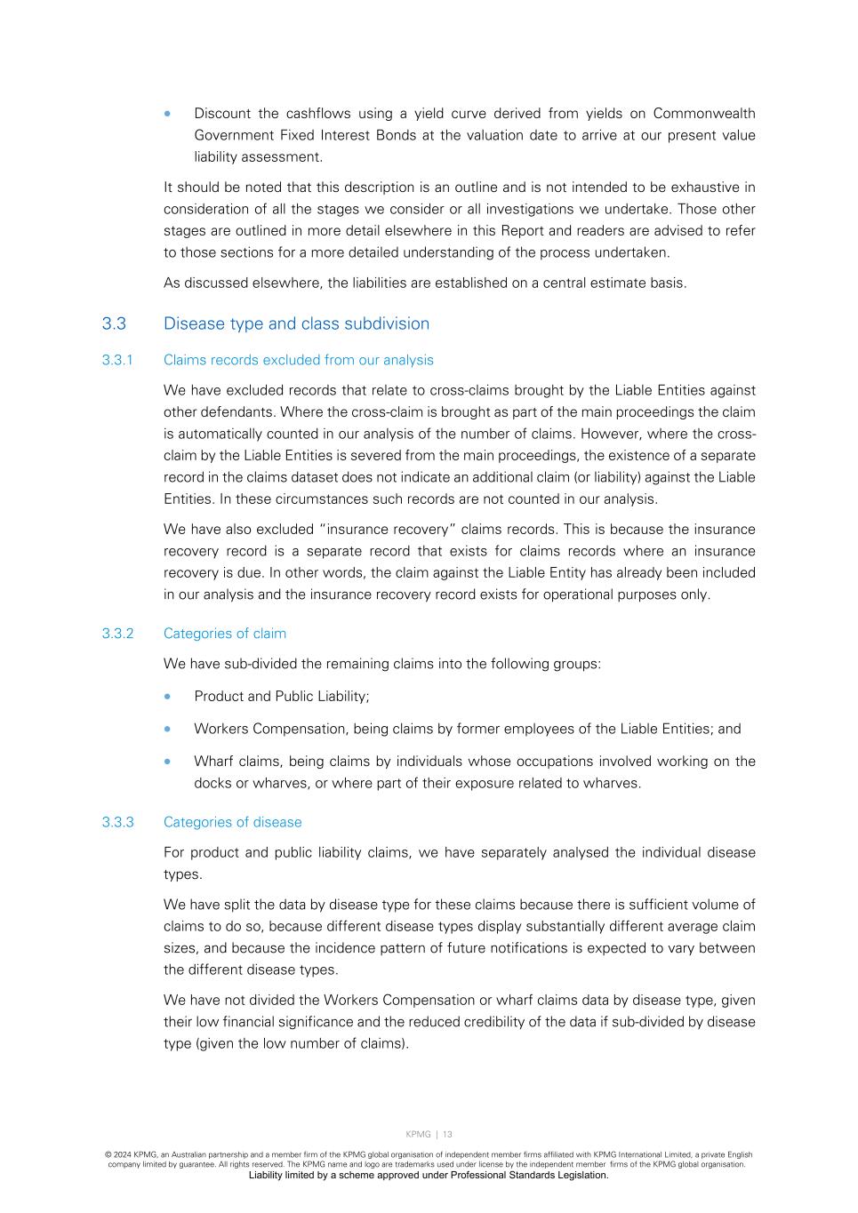 KPMG | 13 © 2024 KPMG, an Australian partnership and a member firm of the KPMG global organisation of independent member firms affiliated with KPMG International Limited, a private English company limited by guarantee. All rights reserved. The KPMG name and logo are trademarks used under license by the independent member firms of the KPMG global organisation. Liability limited by a scheme approved under Professional Standards Legislation. • Discount the cashflows using a yield curve derived from yields on Commonwealth Government Fixed Interest Bonds at the valuation date to arrive at our present value liability assessment. It should be noted that this description is an outline and is not intended to be exhaustive in consideration of all the stages we consider or all investigations we undertake. Those other stages are outlined in more detail elsewhere in this Report and readers are advised to refer to those sections for a more detailed understanding of the process undertaken. As discussed elsewhere, the liabilities are established on a central estimate basis. 3.3 Disease type and class subdivision 3.3.1 Claims records excluded from our analysis We have excluded records that relate to cross-claims brought by the Liable Entities against other defendants. Where the cross-claim is brought as part of the main proceedings the claim is automatically counted in our analysis of the number of claims. However, where the cross- claim by the Liable Entities is severed from the main proceedings, the existence of a separate record in the claims dataset does not indicate an additional claim (or liability) against the Liable Entities. In these circumstances such records are not counted in our analysis. We have also excluded “insurance recovery” claims records. This is because the insurance recovery record is a separate record that exists for claims records where an insurance recovery is due. In other words, the claim against the Liable Entity has already been included in our analysis and the insurance recovery record exists for operational purposes only. 3.3.2 Categories of claim We have sub-divided the remaining claims into the following groups: • Product and Public Liability; • Workers Compensation, being claims by former employees of the Liable Entities; and • Wharf claims, being claims by individuals whose occupations involved working on the docks or wharves, or where part of their exposure related to wharves. 3.3.3 Categories of disease For product and public liability claims, we have separately analysed the individual disease types. We have split the data by disease type for these claims because there is sufficient volume of claims to do so, because different disease types display substantially different average claim sizes, and because the incidence pattern of future notifications is expected to vary between the different disease types. We have not divided the Workers Compensation or wharf claims data by disease type, given their low financial significance and the reduced credibility of the data if sub-divided by disease type (given the low number of claims).