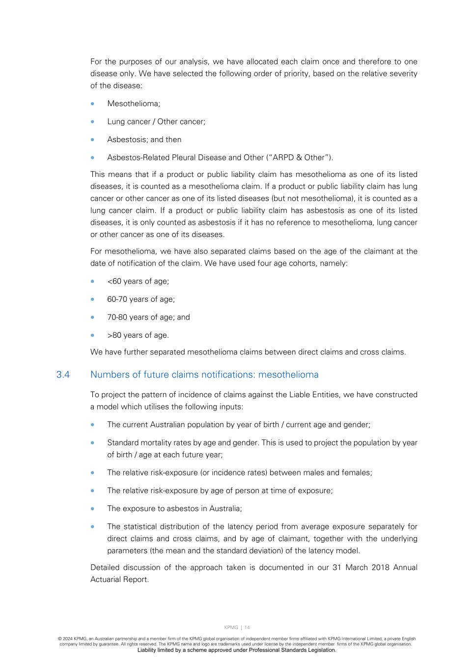 KPMG | 14 © 2024 KPMG, an Australian partnership and a member firm of the KPMG global organisation of independent member firms affiliated with KPMG International Limited, a private English company limited by guarantee. All rights reserved. The KPMG name and logo are trademarks used under license by the independent member firms of the KPMG global organisation. Liability limited by a scheme approved under Professional Standards Legislation. For the purposes of our analysis, we have allocated each claim once and therefore to one disease only. We have selected the following order of priority, based on the relative severity of the disease: • Mesothelioma; • Lung cancer / Other cancer; • Asbestosis; and then • Asbestos-Related Pleural Disease and Other (“ARPD & Other”). This means that if a product or public liability claim has mesothelioma as one of its listed diseases, it is counted as a mesothelioma claim. If a product or public liability claim has lung cancer or other cancer as one of its listed diseases (but not mesothelioma), it is counted as a lung cancer claim. If a product or public liability claim has asbestosis as one of its listed diseases, it is only counted as asbestosis if it has no reference to mesothelioma, lung cancer or other cancer as one of its diseases. For mesothelioma, we have also separated claims based on the age of the claimant at the date of notification of the claim. We have used four age cohorts, namely: • <60 years of age; • 60-70 years of age; • 70-80 years of age; and • >80 years of age. We have further separated mesothelioma claims between direct claims and cross claims. 3.4 Numbers of future claims notifications: mesothelioma To project the pattern of incidence of claims against the Liable Entities, we have constructed a model which utilises the following inputs: • The current Australian population by year of birth / current age and gender; • Standard mortality rates by age and gender. This is used to project the population by year of birth / age at each future year; • The relative risk-exposure (or incidence rates) between males and females; • The relative risk-exposure by age of person at time of exposure; • The exposure to asbestos in Australia; • The statistical distribution of the latency period from average exposure separately for direct claims and cross claims, and by age of claimant, together with the underlying parameters (the mean and the standard deviation) of the latency model. Detailed discussion of the approach taken is documented in our 31 March 2018 Annual Actuarial Report.