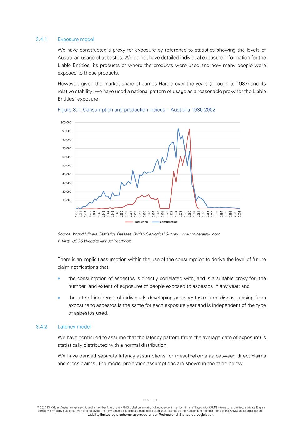 KPMG | 15 © 2024 KPMG, an Australian partnership and a member firm of the KPMG global organisation of independent member firms affiliated with KPMG International Limited, a private English company limited by guarantee. All rights reserved. The KPMG name and logo are trademarks used under license by the independent member firms of the KPMG global organisation. Liability limited by a scheme approved under Professional Standards Legislation. 3.4.1 Exposure model We have constructed a proxy for exposure by reference to statistics showing the levels of Australian usage of asbestos. We do not have detailed individual exposure information for the Liable Entities, its products or where the products were used and how many people were exposed to those products. However, given the market share of James Hardie over the years (through to 1987) and its relative stability, we have used a national pattern of usage as a reasonable proxy for the Liable Entities’ exposure. Figure 3.1: Consumption and production indices – Australia 1930-2002 Source: World Mineral Statistics Dataset, British Geological Survey, www.mineralsuk.com R Virta, USGS Website Annual Yearbook There is an implicit assumption within the use of the consumption to derive the level of future claim notifications that: • the consumption of asbestos is directly correlated with, and is a suitable proxy for, the number (and extent of exposure) of people exposed to asbestos in any year; and • the rate of incidence of individuals developing an asbestos-related disease arising from exposure to asbestos is the same for each exposure year and is independent of the type of asbestos used. 3.4.2 Latency model We have continued to assume that the latency pattern (from the average date of exposure) is statistically distributed with a normal distribution. We have derived separate latency assumptions for mesothelioma as between direct claims and cross claims. The model projection assumptions are shown in the table below. - 10,000 20,000 30,000 40,000 50,000 60,000 70,000 80,000 90,000 100,000 19 30 19 32 19 34 19 36 19 38 19 40 19 42 19 44 19 46 19 48 19 50 19 52 19 54 19 56 19 58 19 60 19 62 19 64 19 66 19 68 19 70 19 72 19 74 19 76 19 78 19 80 19 82 19 84 19 86 19 88 19 90 19 92 19 94 19 96 19 98 20 00 20 02 Production Consumption