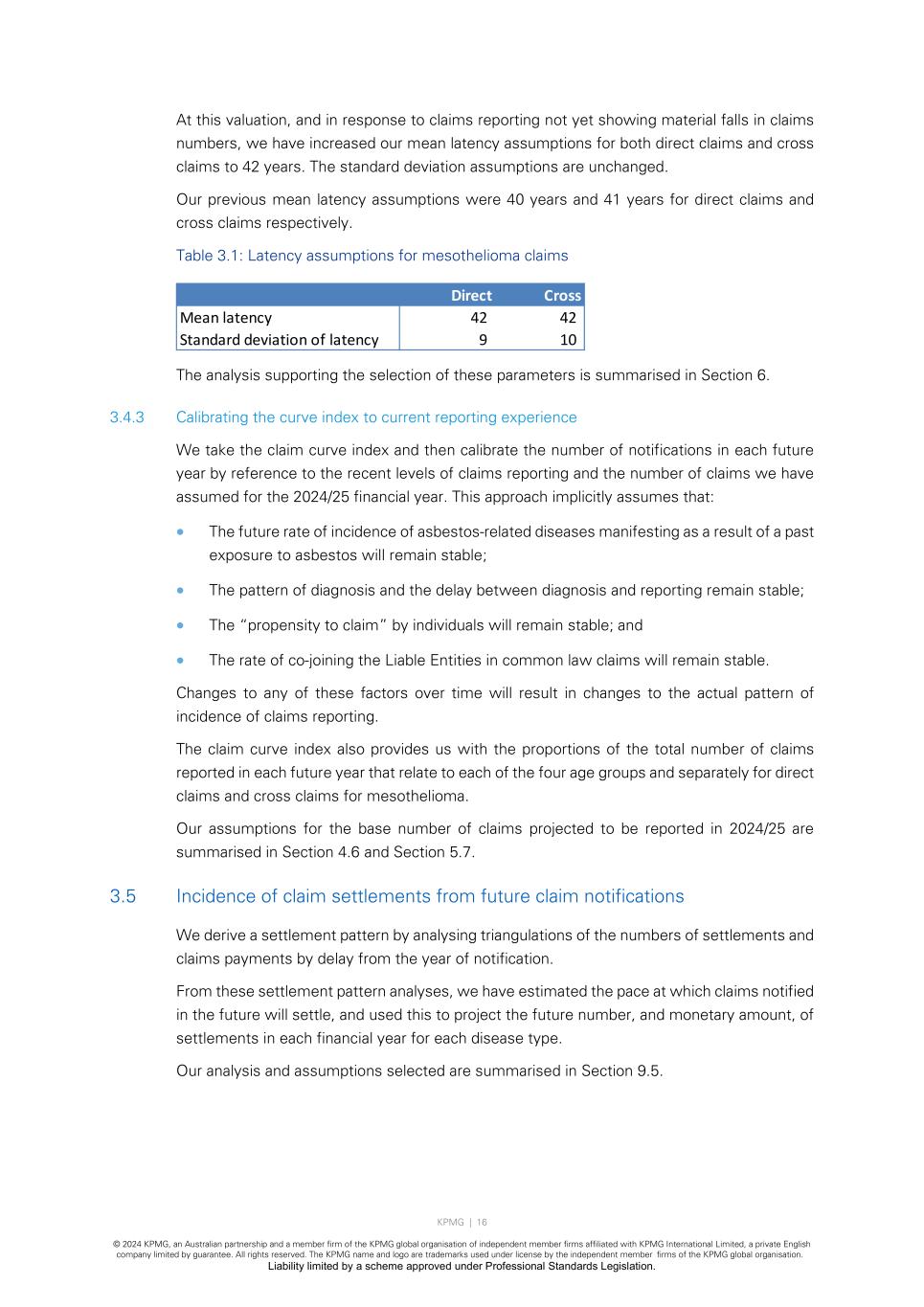 KPMG | 16 © 2024 KPMG, an Australian partnership and a member firm of the KPMG global organisation of independent member firms affiliated with KPMG International Limited, a private English company limited by guarantee. All rights reserved. The KPMG name and logo are trademarks used under license by the independent member firms of the KPMG global organisation. Liability limited by a scheme approved under Professional Standards Legislation. At this valuation, and in response to claims reporting not yet showing material falls in claims numbers, we have increased our mean latency assumptions for both direct claims and cross claims to 42 years. The standard deviation assumptions are unchanged. Our previous mean latency assumptions were 40 years and 41 years for direct claims and cross claims respectively. Table 3.1: Latency assumptions for mesothelioma claims The analysis supporting the selection of these parameters is summarised in Section 6. 3.4.3 Calibrating the curve index to current reporting experience We take the claim curve index and then calibrate the number of notifications in each future year by reference to the recent levels of claims reporting and the number of claims we have assumed for the 2024/25 financial year. This approach implicitly assumes that: • The future rate of incidence of asbestos-related diseases manifesting as a result of a past exposure to asbestos will remain stable; • The pattern of diagnosis and the delay between diagnosis and reporting remain stable; • The “propensity to claim” by individuals will remain stable; and • The rate of co-joining the Liable Entities in common law claims will remain stable. Changes to any of these factors over time will result in changes to the actual pattern of incidence of claims reporting. The claim curve index also provides us with the proportions of the total number of claims reported in each future year that relate to each of the four age groups and separately for direct claims and cross claims for mesothelioma. Our assumptions for the base number of claims projected to be reported in 2024/25 are summarised in Section 4.6 and Section 5.7. 3.5 Incidence of claim settlements from future claim notifications We derive a settlement pattern by analysing triangulations of the numbers of settlements and claims payments by delay from the year of notification. From these settlement pattern analyses, we have estimated the pace at which claims notified in the future will settle, and used this to project the future number, and monetary amount, of settlements in each financial year for each disease type. Our analysis and assumptions selected are summarised in Section 9.5. Direct Cross Mean latency 42 42 Standard deviation of latency 9 10