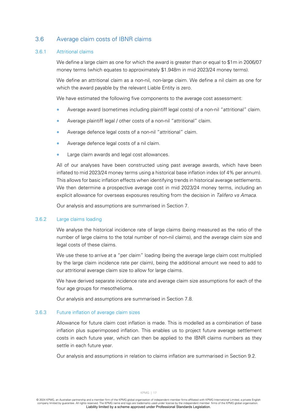 KPMG | 17 © 2024 KPMG, an Australian partnership and a member firm of the KPMG global organisation of independent member firms affiliated with KPMG International Limited, a private English company limited by guarantee. All rights reserved. The KPMG name and logo are trademarks used under license by the independent member firms of the KPMG global organisation. Liability limited by a scheme approved under Professional Standards Legislation. 3.6 Average claim costs of IBNR claims 3.6.1 Attritional claims We define a large claim as one for which the award is greater than or equal to $1m in 2006/07 money terms (which equates to approximately $1.948m in mid 2023/24 money terms). We define an attritional claim as a non-nil, non-large claim. We define a nil claim as one for which the award payable by the relevant Liable Entity is zero. We have estimated the following five components to the average cost assessment: • Average award (sometimes including plaintiff legal costs) of a non-nil “attritional” claim. • Average plaintiff legal / other costs of a non-nil “attritional” claim. • Average defence legal costs of a non-nil “attritional” claim. • Average defence legal costs of a nil claim. • Large claim awards and legal cost allowances. All of our analyses have been constructed using past average awards, which have been inflated to mid 2023/24 money terms using a historical base inflation index (of 4% per annum). This allows for basic inflation effects when identifying trends in historical average settlements. We then determine a prospective average cost in mid 2023/24 money terms, including an explicit allowance for overseas exposures resulting from the decision in Talifero vs Amaca. Our analysis and assumptions are summarised in Section 7. 3.6.2 Large claims loading We analyse the historical incidence rate of large claims (being measured as the ratio of the number of large claims to the total number of non-nil claims), and the average claim size and legal costs of these claims. We use these to arrive at a “per claim” loading (being the average large claim cost multiplied by the large claim incidence rate per claim), being the additional amount we need to add to our attritional average claim size to allow for large claims. We have derived separate incidence rate and average claim size assumptions for each of the four age groups for mesothelioma. Our analysis and assumptions are summarised in Section 7.8. 3.6.3 Future inflation of average claim sizes Allowance for future claim cost inflation is made. This is modelled as a combination of base inflation plus superimposed inflation. This enables us to project future average settlement costs in each future year, which can then be applied to the IBNR claims numbers as they settle in each future year. Our analysis and assumptions in relation to claims inflation are summarised in Section 9.2.