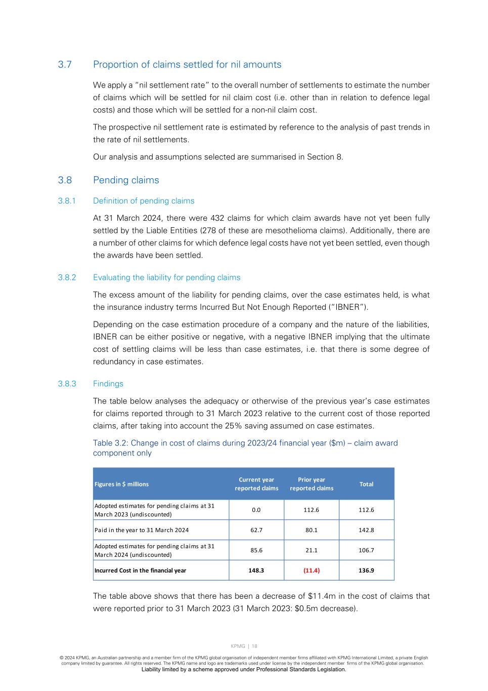 KPMG | 18 © 2024 KPMG, an Australian partnership and a member firm of the KPMG global organisation of independent member firms affiliated with KPMG International Limited, a private English company limited by guarantee. All rights reserved. The KPMG name and logo are trademarks used under license by the independent member firms of the KPMG global organisation. Liability limited by a scheme approved under Professional Standards Legislation. 3.7 Proportion of claims settled for nil amounts We apply a “nil settlement rate” to the overall number of settlements to estimate the number of claims which will be settled for nil claim cost (i.e. other than in relation to defence legal costs) and those which will be settled for a non-nil claim cost. The prospective nil settlement rate is estimated by reference to the analysis of past trends in the rate of nil settlements. Our analysis and assumptions selected are summarised in Section 8. 3.8 Pending claims 3.8.1 Definition of pending claims At 31 March 2024, there were 432 claims for which claim awards have not yet been fully settled by the Liable Entities (278 of these are mesothelioma claims). Additionally, there are a number of other claims for which defence legal costs have not yet been settled, even though the awards have been settled. 3.8.2 Evaluating the liability for pending claims The excess amount of the liability for pending claims, over the case estimates held, is what the insurance industry terms Incurred But Not Enough Reported (“IBNER”). Depending on the case estimation procedure of a company and the nature of the liabilities, IBNER can be either positive or negative, with a negative IBNER implying that the ultimate cost of settling claims will be less than case estimates, i.e. that there is some degree of redundancy in case estimates. 3.8.3 Findings The table below analyses the adequacy or otherwise of the previous year’s case estimates for claims reported through to 31 March 2023 relative to the current cost of those reported claims, after taking into account the 25% saving assumed on case estimates. Table 3.2: Change in cost of claims during 2023/24 financial year ($m) – claim award component only The table above shows that there has been a decrease of $11.4m in the cost of claims that were reported prior to 31 March 2023 (31 March 2023: $0.5m decrease). Figures in $ millions Current year reported claims Prior year reported claims Total Adopted estimates for pending claims at 31 March 2023 (undiscounted) 0.0 112.6 112.6 Paid in the year to 31 March 2024 62.7 80.1 142.8 Adopted estimates for pending claims at 31 March 2024 (undiscounted) 85.6 21.1 106.7 Incurred Cost in the financial year 148.3 (11.4) 136.9