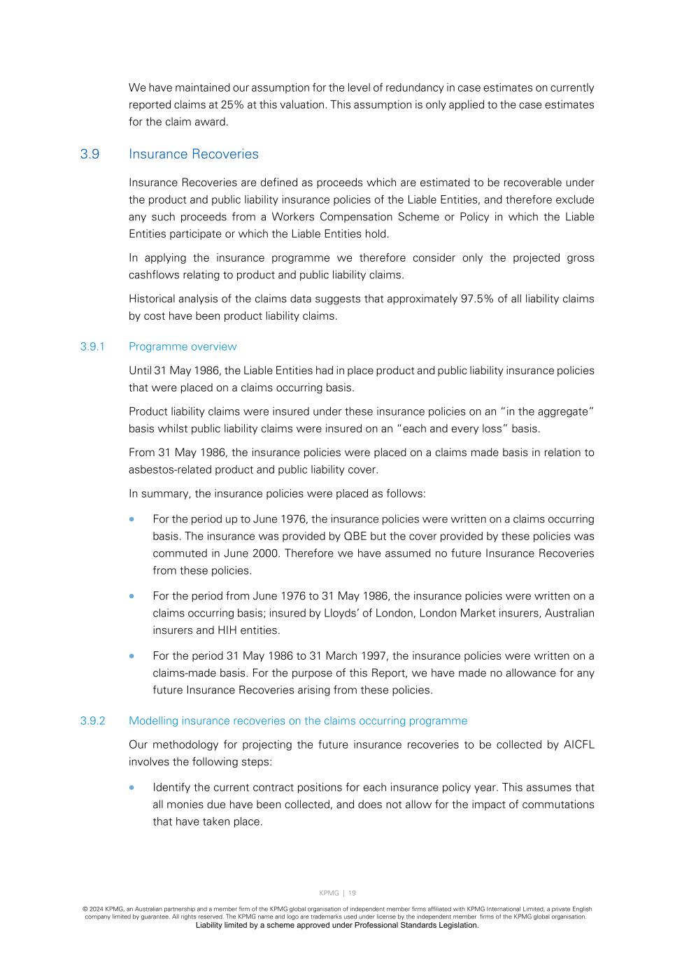 KPMG | 19 © 2024 KPMG, an Australian partnership and a member firm of the KPMG global organisation of independent member firms affiliated with KPMG International Limited, a private English company limited by guarantee. All rights reserved. The KPMG name and logo are trademarks used under license by the independent member firms of the KPMG global organisation. Liability limited by a scheme approved under Professional Standards Legislation. We have maintained our assumption for the level of redundancy in case estimates on currently reported claims at 25% at this valuation. This assumption is only applied to the case estimates for the claim award. 3.9 Insurance Recoveries Insurance Recoveries are defined as proceeds which are estimated to be recoverable under the product and public liability insurance policies of the Liable Entities, and therefore exclude any such proceeds from a Workers Compensation Scheme or Policy in which the Liable Entities participate or which the Liable Entities hold. In applying the insurance programme we therefore consider only the projected gross cashflows relating to product and public liability claims. Historical analysis of the claims data suggests that approximately 97.5% of all liability claims by cost have been product liability claims. 3.9.1 Programme overview Until 31 May 1986, the Liable Entities had in place product and public liability insurance policies that were placed on a claims occurring basis. Product liability claims were insured under these insurance policies on an “in the aggregate” basis whilst public liability claims were insured on an “each and every loss” basis. From 31 May 1986, the insurance policies were placed on a claims made basis in relation to asbestos-related product and public liability cover. In summary, the insurance policies were placed as follows: • For the period up to June 1976, the insurance policies were written on a claims occurring basis. The insurance was provided by QBE but the cover provided by these policies was commuted in June 2000. Therefore we have assumed no future Insurance Recoveries from these policies. • For the period from June 1976 to 31 May 1986, the insurance policies were written on a claims occurring basis; insured by Lloyds’ of London, London Market insurers, Australian insurers and HIH entities. • For the period 31 May 1986 to 31 March 1997, the insurance policies were written on a claims-made basis. For the purpose of this Report, we have made no allowance for any future Insurance Recoveries arising from these policies. 3.9.2 Modelling insurance recoveries on the claims occurring programme Our methodology for projecting the future insurance recoveries to be collected by AICFL involves the following steps: • Identify the current contract positions for each insurance policy year. This assumes that all monies due have been collected, and does not allow for the impact of commutations that have taken place.