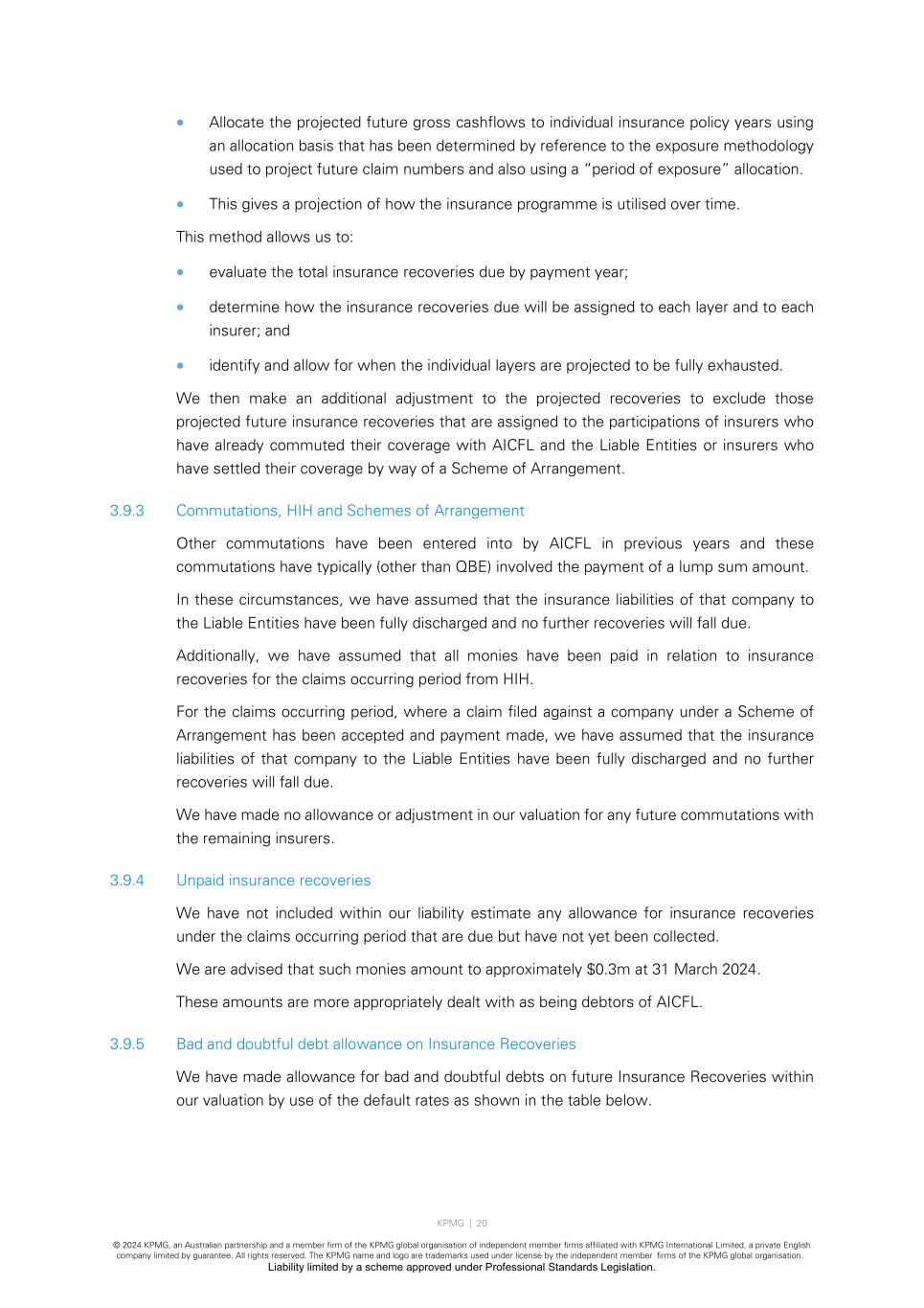 KPMG | 20 © 2024 KPMG, an Australian partnership and a member firm of the KPMG global organisation of independent member firms affiliated with KPMG International Limited, a private English company limited by guarantee. All rights reserved. The KPMG name and logo are trademarks used under license by the independent member firms of the KPMG global organisation. Liability limited by a scheme approved under Professional Standards Legislation. • Allocate the projected future gross cashflows to individual insurance policy years using an allocation basis that has been determined by reference to the exposure methodology used to project future claim numbers and also using a “period of exposure” allocation. • This gives a projection of how the insurance programme is utilised over time. This method allows us to: • evaluate the total insurance recoveries due by payment year; • determine how the insurance recoveries due will be assigned to each layer and to each insurer; and • identify and allow for when the individual layers are projected to be fully exhausted. We then make an additional adjustment to the projected recoveries to exclude those projected future insurance recoveries that are assigned to the participations of insurers who have already commuted their coverage with AICFL and the Liable Entities or insurers who have settled their coverage by way of a Scheme of Arrangement. 3.9.3 Commutations, HIH and Schemes of Arrangement Other commutations have been entered into by AICFL in previous years and these commutations have typically (other than QBE) involved the payment of a lump sum amount. In these circumstances, we have assumed that the insurance liabilities of that company to the Liable Entities have been fully discharged and no further recoveries will fall due. Additionally, we have assumed that all monies have been paid in relation to insurance recoveries for the claims occurring period from HIH. For the claims occurring period, where a claim filed against a company under a Scheme of Arrangement has been accepted and payment made, we have assumed that the insurance liabilities of that company to the Liable Entities have been fully discharged and no further recoveries will fall due. We have made no allowance or adjustment in our valuation for any future commutations with the remaining insurers. 3.9.4 Unpaid insurance recoveries We have not included within our liability estimate any allowance for insurance recoveries under the claims occurring period that are due but have not yet been collected. We are advised that such monies amount to approximately $0.3m at 31 March 2024. These amounts are more appropriately dealt with as being debtors of AICFL. 3.9.5 Bad and doubtful debt allowance on Insurance Recoveries We have made allowance for bad and doubtful debts on future Insurance Recoveries within our valuation by use of the default rates as shown in the table below.