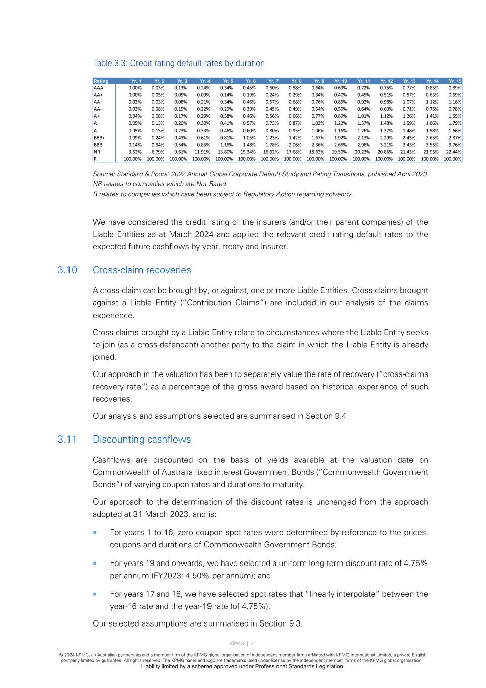 KPMG | 21 © 2024 KPMG, an Australian partnership and a member firm of the KPMG global organisation of independent member firms affiliated with KPMG International Limited, a private English company limited by guarantee. All rights reserved. The KPMG name and logo are trademarks used under license by the independent member firms of the KPMG global organisation. Liability limited by a scheme approved under Professional Standards Legislation. Table 3.3: Credit rating default rates by duration Source: Standard & Poors’ 2022 Annual Global Corporate Default Study and Rating Transitions, published April 2023. NR relates to companies which are Not Rated R relates to companies which have been subject to Regulatory Action regarding solvency. We have considered the credit rating of the insurers (and/or their parent companies) of the Liable Entities as at March 2024 and applied the relevant credit rating default rates to the expected future cashflows by year, treaty and insurer. 3.10 Cross-claim recoveries A cross-claim can be brought by, or against, one or more Liable Entities. Cross-claims brought against a Liable Entity (“Contribution Claims”) are included in our analysis of the claims experience. Cross-claims brought by a Liable Entity relate to circumstances where the Liable Entity seeks to join (as a cross-defendant) another party to the claim in which the Liable Entity is already joined. Our approach in the valuation has been to separately value the rate of recovery (“cross-claims recovery rate”) as a percentage of the gross award based on historical experience of such recoveries. Our analysis and assumptions selected are summarised in Section 9.4. 3.11 Discounting cashflows Cashflows are discounted on the basis of yields available at the valuation date on Commonwealth of Australia fixed interest Government Bonds (“Commonwealth Government Bonds”) of varying coupon rates and durations to maturity. Our approach to the determination of the discount rates is unchanged from the approach adopted at 31 March 2023, and is: • For years 1 to 16, zero coupon spot rates were determined by reference to the prices, coupons and durations of Commonwealth Government Bonds; • For years 19 and onwards, we have selected a uniform long-term discount rate of 4.75% per annum (FY2023: 4.50% per annum); and • For years 17 and 18, we have selected spot rates that “linearly interpolate” between the year-16 rate and the year-19 rate (of 4.75%). Our selected assumptions are summarised in Section 9.3. Rating Yr. 1 Yr. 2 Yr. 3 Yr. 4 Yr. 5 Yr. 6 Yr. 7 Yr. 8 Yr. 9 Yr. 10 Yr. 11 Yr. 12 Yr. 13 Yr. 14 Yr. 15 AAA 0.00% 0.03% 0.13% 0.24% 0.34% 0.45% 0.50% 0.58% 0.64% 0.69% 0.72% 0.75% 0.77% 0.83% 0.89% AA+ 0.00% 0.05% 0.05% 0.09% 0.14% 0.19% 0.24% 0.29% 0.34% 0.40% 0.45% 0.51% 0.57% 0.63% 0.69% AA 0.02% 0.03% 0.08% 0.21% 0.34% 0.46% 0.57% 0.68% 0.76% 0.85% 0.92% 0.98% 1.07% 1.12% 1.18% AA- 0.03% 0.08% 0.15% 0.22% 0.29% 0.39% 0.45% 0.49% 0.54% 0.59% 0.64% 0.69% 0.71% 0.75% 0.78% A+ 0.04% 0.08% 0.17% 0.29% 0.38% 0.46% 0.56% 0.66% 0.77% 0.89% 1.01% 1.12% 1.26% 1.41% 1.55% A 0.05% 0.13% 0.20% 0.30% 0.41% 0.57% 0.73% 0.87% 1.03% 1.22% 1.37% 1.48% 1.59% 1.66% 1.79% A- 0.05% 0.15% 0.23% 0.33% 0.46% 0.60% 0.80% 0.95% 1.06% 1.16% 1.26% 1.37% 1.48% 1.58% 1.66% BBB+ 0.09% 0.24% 0.43% 0.61% 0.81% 1.05% 1.23% 1.42% 1.67% 1.92% 2.13% 2.29% 2.45% 2.65% 2.87% BBB 0.14% 0.34% 0.54% 0.85% 1.16% 1.48% 1.78% 2.06% 2.36% 2.65% 2.96% 3.21% 3.43% 3.55% 3.76% NR 3.52% 6.79% 9.61% 11.91% 13.80% 15.34% 16.62% 17.68% 18.63% 19.50% 20.23% 20.85% 21.43% 21.95% 22.44% R 100.00% 100.00% 100.00% 100.00% 100.00% 100.00% 100.00% 100.00% 100.00% 100.00% 100.00% 100.00% 100.00% 100.00% 100.00%