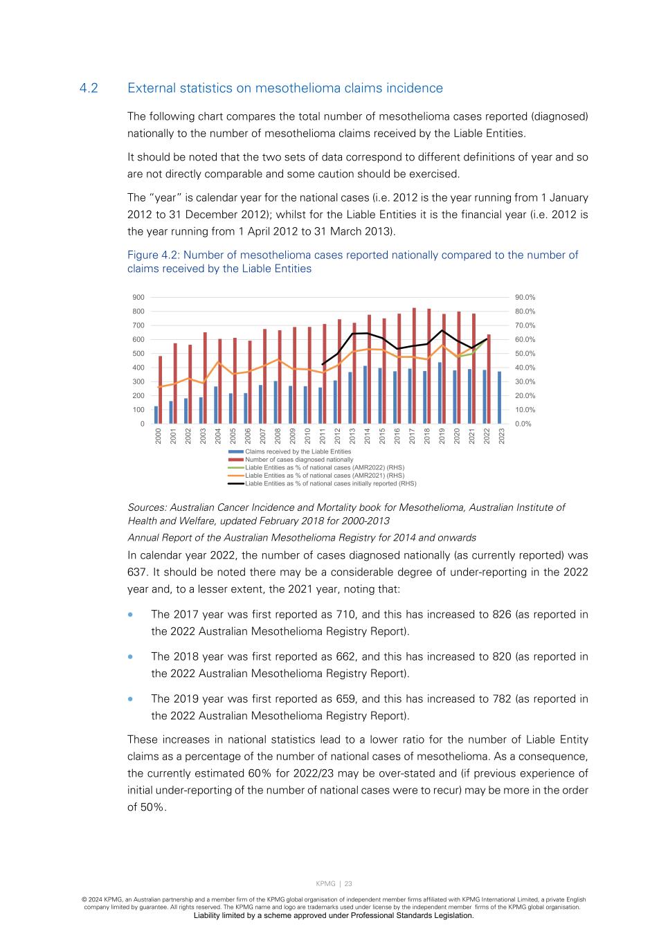 KPMG | 23 © 2024 KPMG, an Australian partnership and a member firm of the KPMG global organisation of independent member firms affiliated with KPMG International Limited, a private English company limited by guarantee. All rights reserved. The KPMG name and logo are trademarks used under license by the independent member firms of the KPMG global organisation. Liability limited by a scheme approved under Professional Standards Legislation. 4.2 External statistics on mesothelioma claims incidence The following chart compares the total number of mesothelioma cases reported (diagnosed) nationally to the number of mesothelioma claims received by the Liable Entities. It should be noted that the two sets of data correspond to different definitions of year and so are not directly comparable and some caution should be exercised. The “year” is calendar year for the national cases (i.e. 2012 is the year running from 1 January 2012 to 31 December 2012); whilst for the Liable Entities it is the financial year (i.e. 2012 is the year running from 1 April 2012 to 31 March 2013). Figure 4.2: Number of mesothelioma cases reported nationally compared to the number of claims received by the Liable Entities Sources: Australian Cancer Incidence and Mortality book for Mesothelioma, Australian Institute of Health and Welfare, updated February 2018 for 2000-2013 Annual Report of the Australian Mesothelioma Registry for 2014 and onwards In calendar year 2022, the number of cases diagnosed nationally (as currently reported) was 637. It should be noted there may be a considerable degree of under-reporting in the 2022 year and, to a lesser extent, the 2021 year, noting that: • The 2017 year was first reported as 710, and this has increased to 826 (as reported in the 2022 Australian Mesothelioma Registry Report). • The 2018 year was first reported as 662, and this has increased to 820 (as reported in the 2022 Australian Mesothelioma Registry Report). • The 2019 year was first reported as 659, and this has increased to 782 (as reported in the 2022 Australian Mesothelioma Registry Report). These increases in national statistics lead to a lower ratio for the number of Liable Entity claims as a percentage of the number of national cases of mesothelioma. As a consequence, the currently estimated 60% for 2022/23 may be over-stated and (if previous experience of initial under-reporting of the number of national cases were to recur) may be more in the order of 50%. 0.0% 10.0% 20.0% 30.0% 40.0% 50.0% 60.0% 70.0% 80.0% 90.0% 0 100 200 300 400 500 600 700 800 900 20 00 20 01 20 02 20 03 20 04 20 05 20 06 20 07 20 08 20 09 20 10 20 11 20 12 20 13 20 14 20 15 20 16 20 17 20 18 20 19 20 20 20 21 20 22 20 23 Claims received by the Liable Entities Number of cases diagnosed nationally Liable Entities as % of national cases (AMR2022) (RHS) Liable Entities as % of national cases (AMR2021) (RHS) Liable Entities as % of national cases initially reported (RHS)