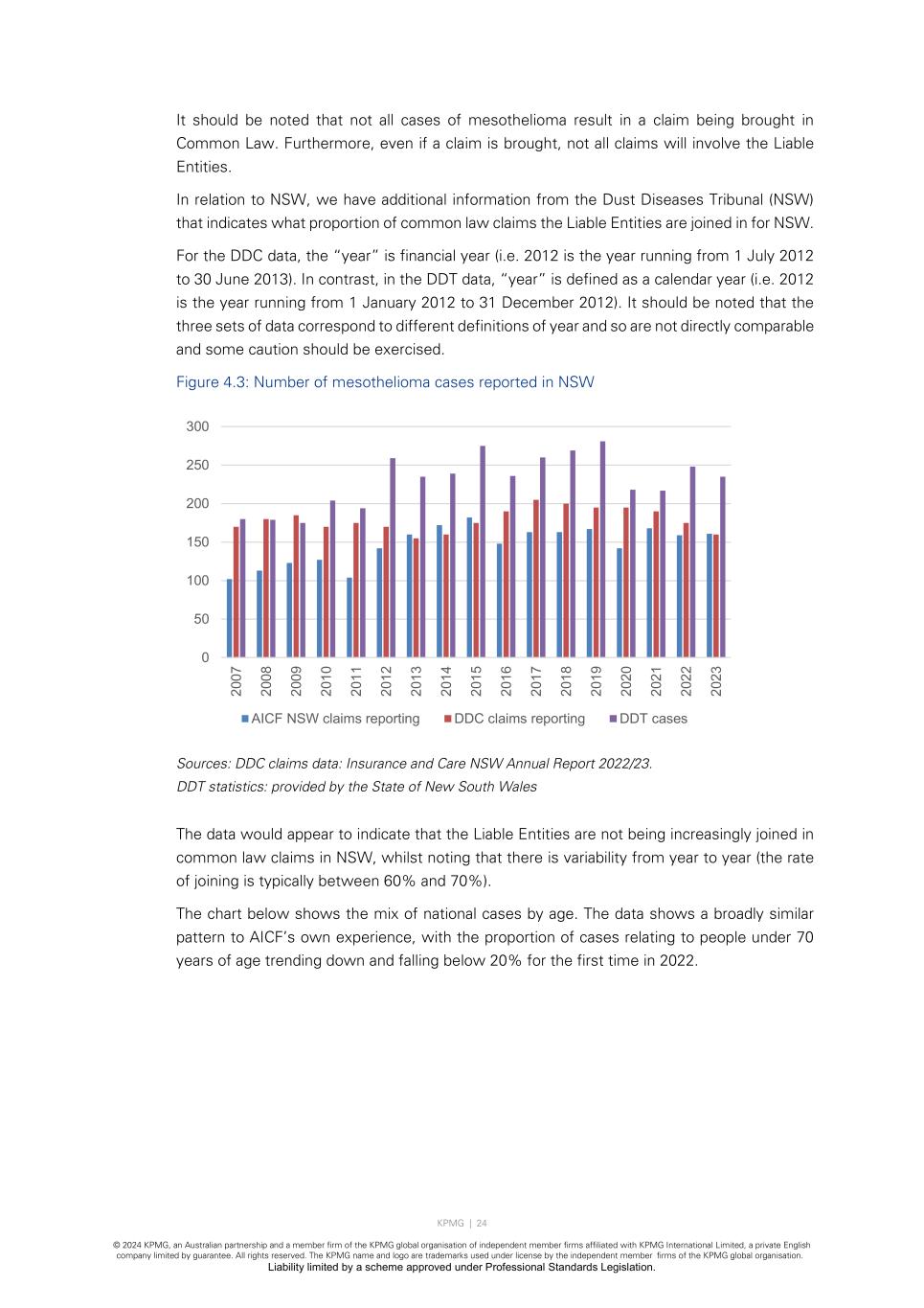 KPMG | 24 © 2024 KPMG, an Australian partnership and a member firm of the KPMG global organisation of independent member firms affiliated with KPMG International Limited, a private English company limited by guarantee. All rights reserved. The KPMG name and logo are trademarks used under license by the independent member firms of the KPMG global organisation. Liability limited by a scheme approved under Professional Standards Legislation. It should be noted that not all cases of mesothelioma result in a claim being brought in Common Law. Furthermore, even if a claim is brought, not all claims will involve the Liable Entities. In relation to NSW, we have additional information from the Dust Diseases Tribunal (NSW) that indicates what proportion of common law claims the Liable Entities are joined in for NSW. For the DDC data, the “year” is financial year (i.e. 2012 is the year running from 1 July 2012 to 30 June 2013). In contrast, in the DDT data, “year” is defined as a calendar year (i.e. 2012 is the year running from 1 January 2012 to 31 December 2012). It should be noted that the three sets of data correspond to different definitions of year and so are not directly comparable and some caution should be exercised. Figure 4.3: Number of mesothelioma cases reported in NSW Sources: DDC claims data: Insurance and Care NSW Annual Report 2022/23. DDT statistics: provided by the State of New South Wales The data would appear to indicate that the Liable Entities are not being increasingly joined in common law claims in NSW, whilst noting that there is variability from year to year (the rate of joining is typically between 60% and 70%). The chart below shows the mix of national cases by age. The data shows a broadly similar pattern to AICF’s own experience, with the proportion of cases relating to people under 70 years of age trending down and falling below 20% for the first time in 2022. 0 50 100 150 200 250 300 20 07 20 08 20 09 20 10 20 11 20 12 20 13 20 14 20 15 20 16 20 17 20 18 20 19 20 20 20 21 20 22 20 23 AICF NSW claims reporting DDC claims reporting DDT cases