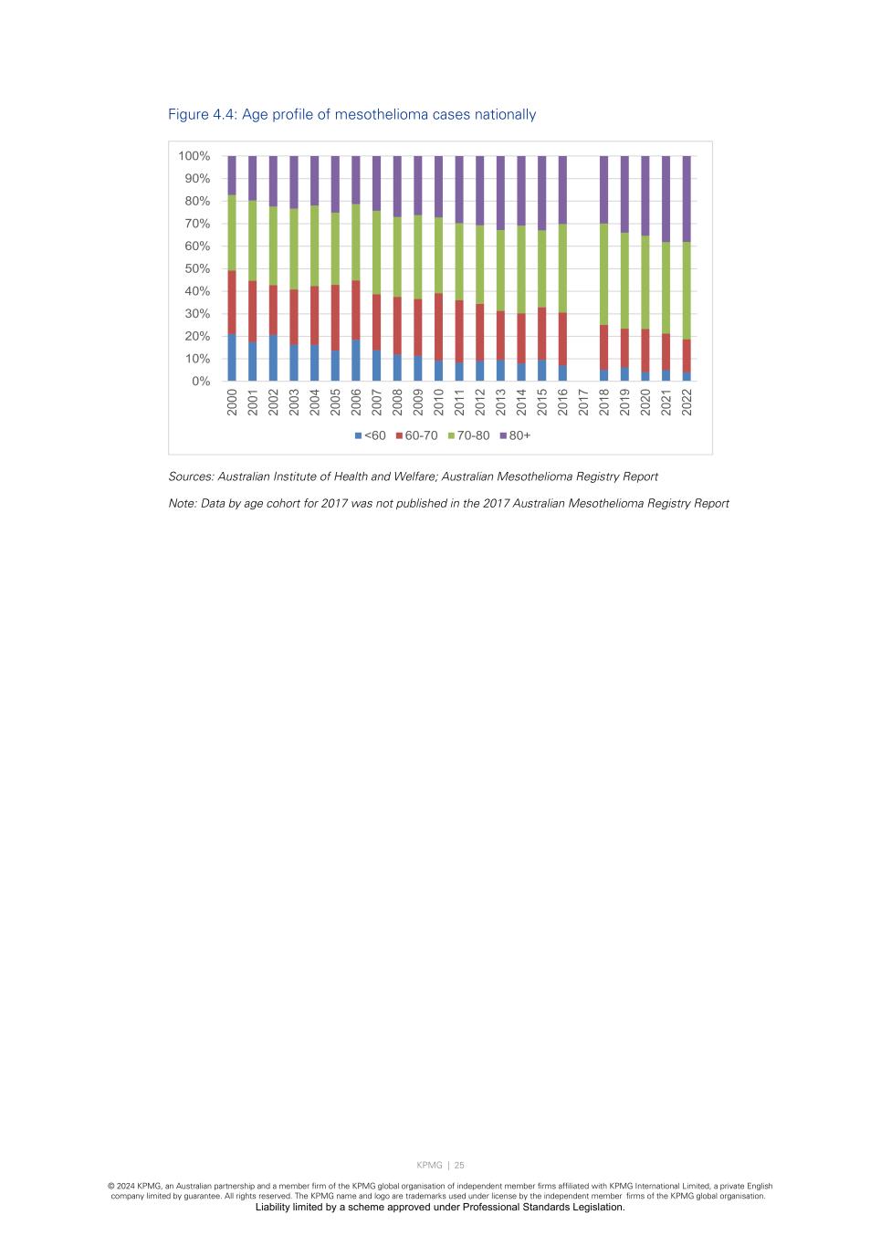 KPMG | 25 © 2024 KPMG, an Australian partnership and a member firm of the KPMG global organisation of independent member firms affiliated with KPMG International Limited, a private English company limited by guarantee. All rights reserved. The KPMG name and logo are trademarks used under license by the independent member firms of the KPMG global organisation. Liability limited by a scheme approved under Professional Standards Legislation. Figure 4.4: Age profile of mesothelioma cases nationally Sources: Australian Institute of Health and Welfare; Australian Mesothelioma Registry Report Note: Data by age cohort for 2017 was not published in the 2017 Australian Mesothelioma Registry Report 0% 10% 20% 30% 40% 50% 60% 70% 80% 90% 100% 20 00 20 01 20 02 20 03 20 04 20 05 20 06 20 07 20 08 20 09 20 10 20 11 20 12 20 13 20 14 20 15 20 16 20 17 20 18 20 19 20 20 20 21 20 22 <60 60-70 70-80 80+
