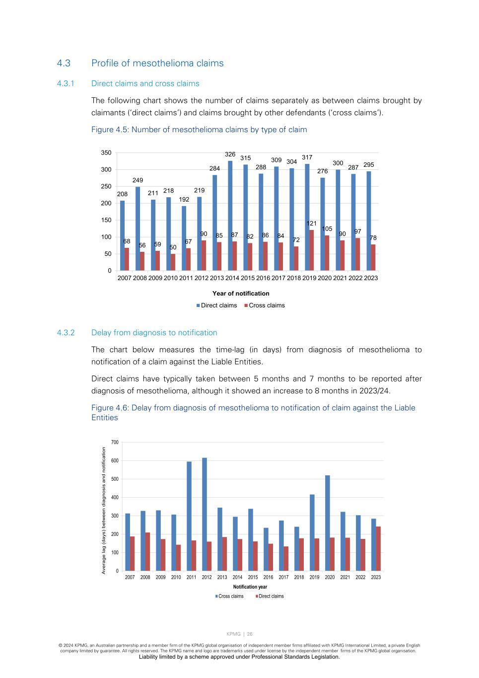 KPMG | 26 © 2024 KPMG, an Australian partnership and a member firm of the KPMG global organisation of independent member firms affiliated with KPMG International Limited, a private English company limited by guarantee. All rights reserved. The KPMG name and logo are trademarks used under license by the independent member firms of the KPMG global organisation. Liability limited by a scheme approved under Professional Standards Legislation. 4.3 Profile of mesothelioma claims 4.3.1 Direct claims and cross claims The following chart shows the number of claims separately as between claims brought by claimants (‘direct claims’) and claims brought by other defendants (‘cross claims’). Figure 4.5: Number of mesothelioma claims by type of claim 4.3.2 Delay from diagnosis to notification The chart below measures the time-lag (in days) from diagnosis of mesothelioma to notification of a claim against the Liable Entities. Direct claims have typically taken between 5 months and 7 months to be reported after diagnosis of mesothelioma, although it showed an increase to 8 months in 2023/24. Figure 4.6: Delay from diagnosis of mesothelioma to notification of claim against the Liable Entities 208 249 211 218 192 219 284 326 315 288 309 304 317 276 300 287 295 68 56 59 50 67 90 85 87 82 86 84 72 121 105 90 97 78 0 50 100 150 200 250 300 350 2007 2008 2009 2010 2011 2012 2013 2014 2015 2016 2017 2018 2019 2020 2021 2022 2023 Year of notification Direct claims Cross claims 0 100 200 300 400 500 600 700 2007 2008 2009 2010 2011 2012 2013 2014 2015 2016 2017 2018 2019 2020 2021 2022 2023 A ve ra ge la g (d ay s) b et w ee n di ag no si s an d no tif ic at io n Notification year Cross claims Direct claims