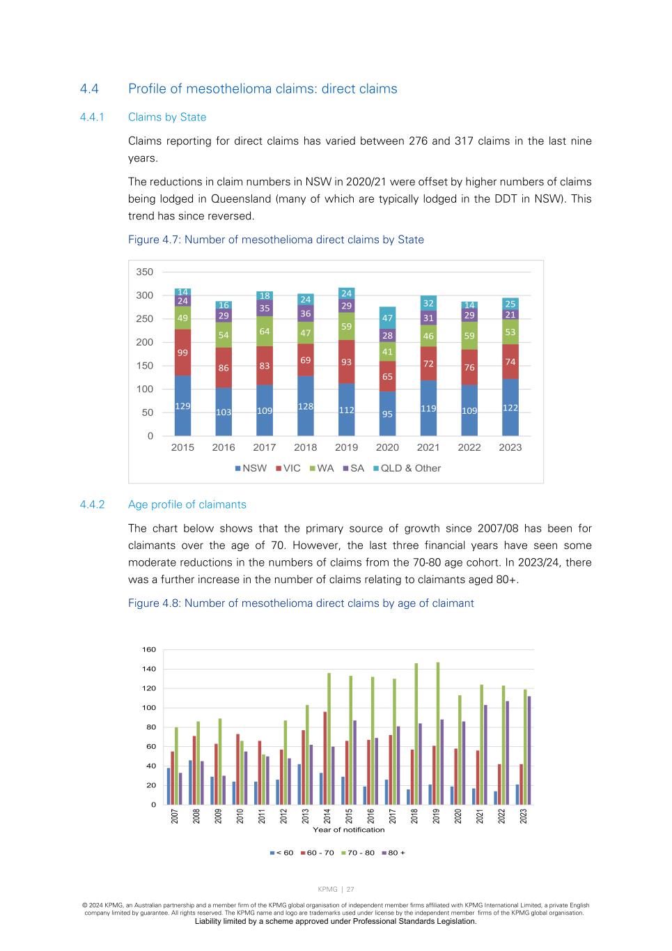 KPMG | 27 © 2024 KPMG, an Australian partnership and a member firm of the KPMG global organisation of independent member firms affiliated with KPMG International Limited, a private English company limited by guarantee. All rights reserved. The KPMG name and logo are trademarks used under license by the independent member firms of the KPMG global organisation. Liability limited by a scheme approved under Professional Standards Legislation. 4.4 Profile of mesothelioma claims: direct claims 4.4.1 Claims by State Claims reporting for direct claims has varied between 276 and 317 claims in the last nine years. The reductions in claim numbers in NSW in 2020/21 were offset by higher numbers of claims being lodged in Queensland (many of which are typically lodged in the DDT in NSW). This trend has since reversed. Figure 4.7: Number of mesothelioma direct claims by State 4.4.2 Age profile of claimants The chart below shows that the primary source of growth since 2007/08 has been for claimants over the age of 70. However, the last three financial years have seen some moderate reductions in the numbers of claims from the 70-80 age cohort. In 2023/24, there was a further increase in the number of claims relating to claimants aged 80+. Figure 4.8: Number of mesothelioma direct claims by age of claimant 129 103 109 128 112 95 119 109 122 99 86 83 69 93 65 72 76 74 49 54 64 47 59 41 46 59 53 24 29 35 36 29 28 31 29 21 14 16 18 24 24 47 32 14 25 0 50 100 150 200 250 300 350 2015 2016 2017 2018 2019 2020 2021 2022 2023 NSW VIC WA SA QLD & Other 0 20 40 60 80 100 120 140 160 20 07 20 08 20 09 20 10 20 11 20 12 20 13 20 14 20 15 20 16 20 17 20 18 20 19 20 20 20 21 20 22 20 23 Year of notification < 60 60 - 70 70 - 80 80 +