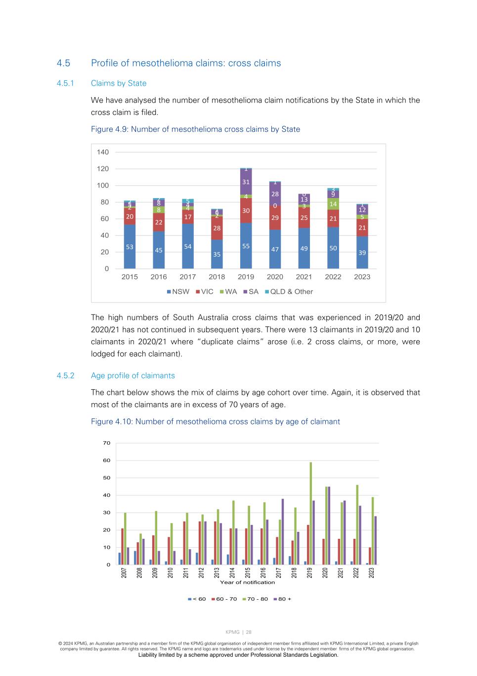 KPMG | 28 © 2024 KPMG, an Australian partnership and a member firm of the KPMG global organisation of independent member firms affiliated with KPMG International Limited, a private English company limited by guarantee. All rights reserved. The KPMG name and logo are trademarks used under license by the independent member firms of the KPMG global organisation. Liability limited by a scheme approved under Professional Standards Legislation. 4.5 Profile of mesothelioma claims: cross claims 4.5.1 Claims by State We have analysed the number of mesothelioma claim notifications by the State in which the cross claim is filed. Figure 4.9: Number of mesothelioma cross claims by State The high numbers of South Australia cross claims that was experienced in 2019/20 and 2020/21 has not continued in subsequent years. There were 13 claimants in 2019/20 and 10 claimants in 2020/21 where “duplicate claims” arose (i.e. 2 cross claims, or more, were lodged for each claimant). 4.5.2 Age profile of claimants The chart below shows the mix of claims by age cohort over time. Again, it is observed that most of the claimants are in excess of 70 years of age. Figure 4.10: Number of mesothelioma cross claims by age of claimant 53 45 54 35 55 47 49 50 39 20 22 17 28 30 29 25 21 21 2 8 4 2 4 0 3 14 5 5 8 4 6 31 28 13 9 12 2 2 5 1 1 1 0 3 1 0 20 40 60 80 100 120 140 2015 2016 2017 2018 2019 2020 2021 2022 2023 NSW VIC WA SA QLD & Other 0 10 20 30 40 50 60 70 20 07 20 08 20 09 20 10 20 11 20 12 20 13 20 14 20 15 20 16 20 17 20 18 20 19 20 20 20 21 20 22 20 23 Year of notification < 60 60 - 70 70 - 80 80 +