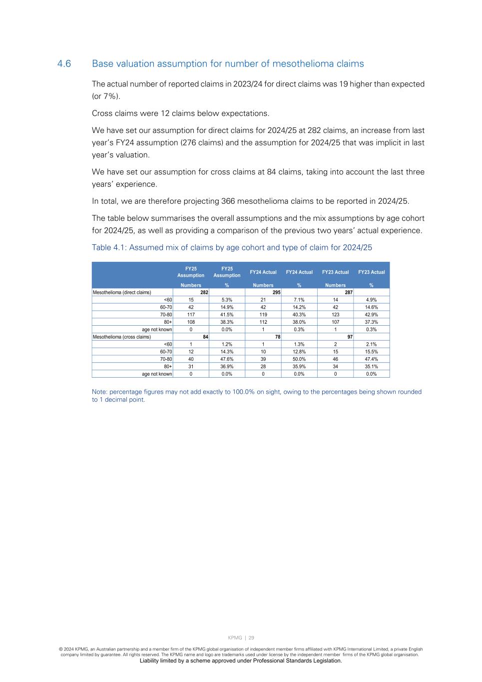 KPMG | 29 © 2024 KPMG, an Australian partnership and a member firm of the KPMG global organisation of independent member firms affiliated with KPMG International Limited, a private English company limited by guarantee. All rights reserved. The KPMG name and logo are trademarks used under license by the independent member firms of the KPMG global organisation. Liability limited by a scheme approved under Professional Standards Legislation. 4.6 Base valuation assumption for number of mesothelioma claims The actual number of reported claims in 2023/24 for direct claims was 19 higher than expected (or 7%). Cross claims were 12 claims below expectations. We have set our assumption for direct claims for 2024/25 at 282 claims, an increase from last year’s FY24 assumption (276 claims) and the assumption for 2024/25 that was implicit in last year’s valuation. We have set our assumption for cross claims at 84 claims, taking into account the last three years’ experience. In total, we are therefore projecting 366 mesothelioma claims to be reported in 2024/25. The table below summarises the overall assumptions and the mix assumptions by age cohort for 2024/25, as well as providing a comparison of the previous two years’ actual experience. Table 4.1: Assumed mix of claims by age cohort and type of claim for 2024/25 Note: percentage figures may not add exactly to 100.0% on sight, owing to the percentages being shown rounded to 1 decimal point. FY25 Assumption FY25 Assumption FY24 Actual FY24 Actual FY23 Actual FY23 Actual Numbers % Numbers % Numbers % Mesothelioma (direct claims) 282 295 287 <60 15 5.3% 21 7.1% 14 4.9% 60-70 42 14.9% 42 14.2% 42 14.6% 70-80 117 41.5% 119 40.3% 123 42.9% 80+ 108 38.3% 112 38.0% 107 37.3% age not known 0 0.0% 1 0.3% 1 0.3% Mesothelioma (cross claims) 84 78 97 <60 1 1.2% 1 1.3% 2 2.1% 60-70 12 14.3% 10 12.8% 15 15.5% 70-80 40 47.6% 39 50.0% 46 47.4% 80+ 31 36.9% 28 35.9% 34 35.1% age not known 0 0.0% 0 0.0% 0 0.0%
